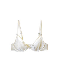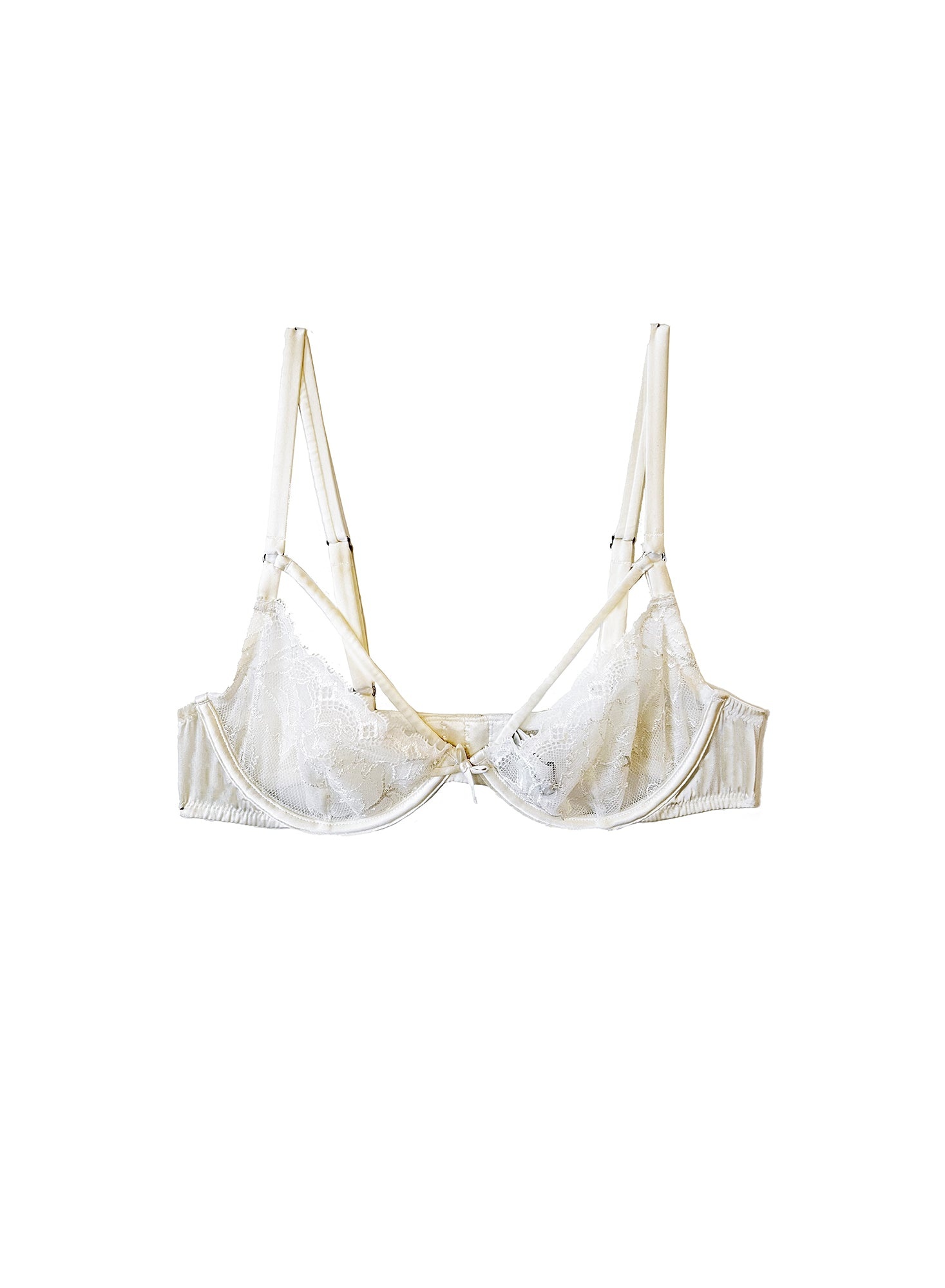 Features silk front straps that frame the bust and center front bow detail. Adjustable straps with back hook and eye closure for a customized fit. Complete the set with the Gardenia Lace Thong and Garter Belt. Materials & Care - Body: 95% Silk & 5% Elastane - Lace: 83% Polyamide & 17% Elastane - Hand wash cold, lay flat to dry - SKU: BR0231-0546-32B Size & Fit - Model is wearing a size 34B.