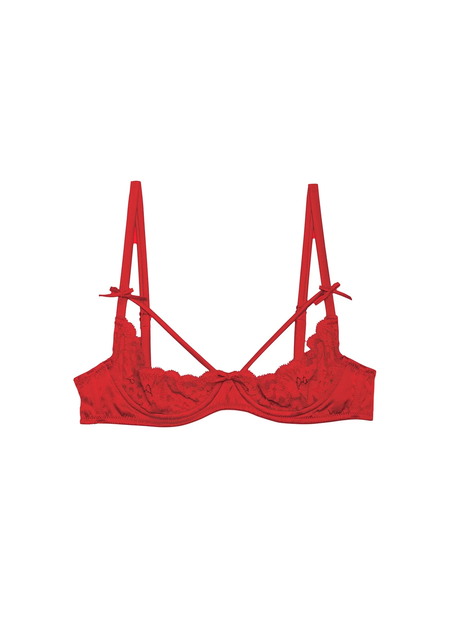 Play peekaboo in our barely-there underwire bra. Charlotte lace quarter cup with silk front straps that frame the bust. Bows at center front and front straps. Stretch satin band with swan hook closure. Complete the look with the Charlotte Lace Crotchless Panty. Materials & Care - Body: 92% Silk & 8% Elastane - Lace: 88% Polyamide & 12% Elastane - Dry clean or hand wash cold hang or lay flat to dry. Do not soak. - SKU: BR0085-0323-32B Size & Fit - Model is wearing a size 34B.