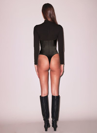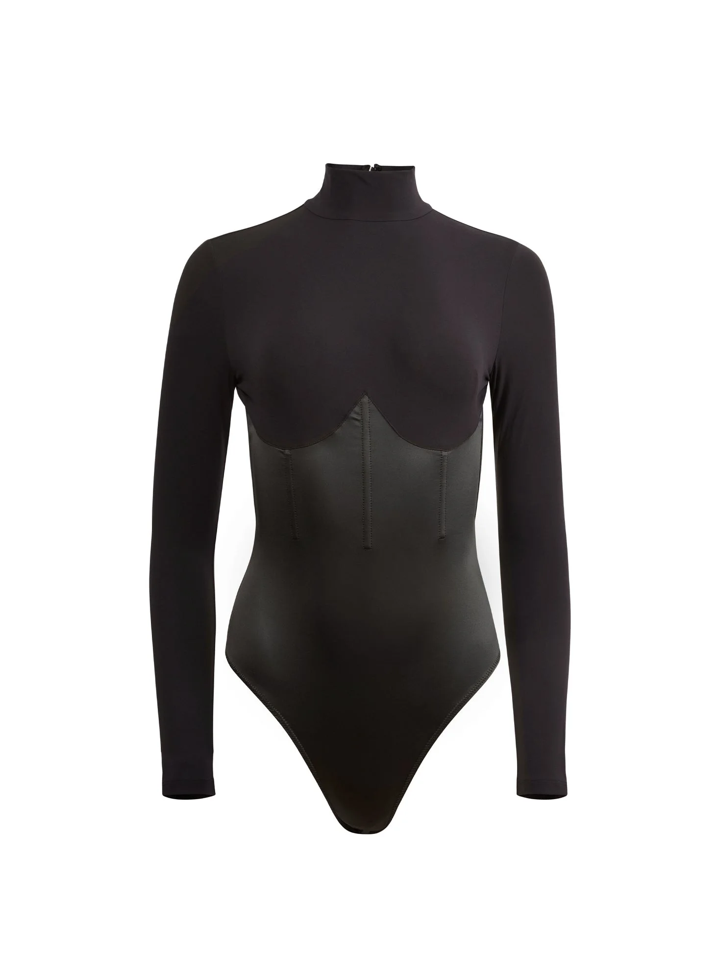 Tighten up. Our ultra sexy Mock Neck Long Sleeve Bodysuit. Soft stretch jersey on the top portion hugs your body in all the right places. Bottom portion features luxe stretch satin with princess seams and boning to hold you in and give shape. Thong cut. Looks chic with the Zipper Split Hem Pant. Materials & Care - Body: 67% Recycled Polyamide & 33% Elastane - Combo: 76% Acetate, 21% Polyamide & 3% Elastane - Gusset Lining: 100% Cotton - Dry clean only - - SKU: BS0199-0100-XS Size & Fit - Model is 5'11 and wearing a size Small. - Front neckline seam to center back crotch seam measures approx 26 ⅜”
