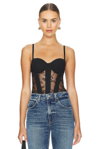 - Self: 75% recycled polyamide 25% elastane Contrast Fabric 1: 85% polyamide 15% elastane Contrast fabric 2: 92% silk 8% elastane Lining: 100% cotton - Made in China - Hand wash - Gusset snap button closure with bikini back - Padded underwire cups - Back zipper closure - Detachable and adjustable shoulder straps - Lace and jersey fabrics - Revolve Style No. FLER-WS82 - Manufacturer Style No. BS0408