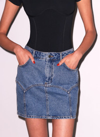 Our Denim Garter Skirt, featuring flattering garter seam details with zip fly closure and front and back pockets. Take it from brunch to bar with the Button Down Bodysuit. Materials & Care - Body: 100% Cotton - Dry clean or machine wash cold, lay flat to dry. Do not bleach or tumble dry. - SKU: SK0210-0959 Size & Fit - Model is 5'11 and wearing a size 4.