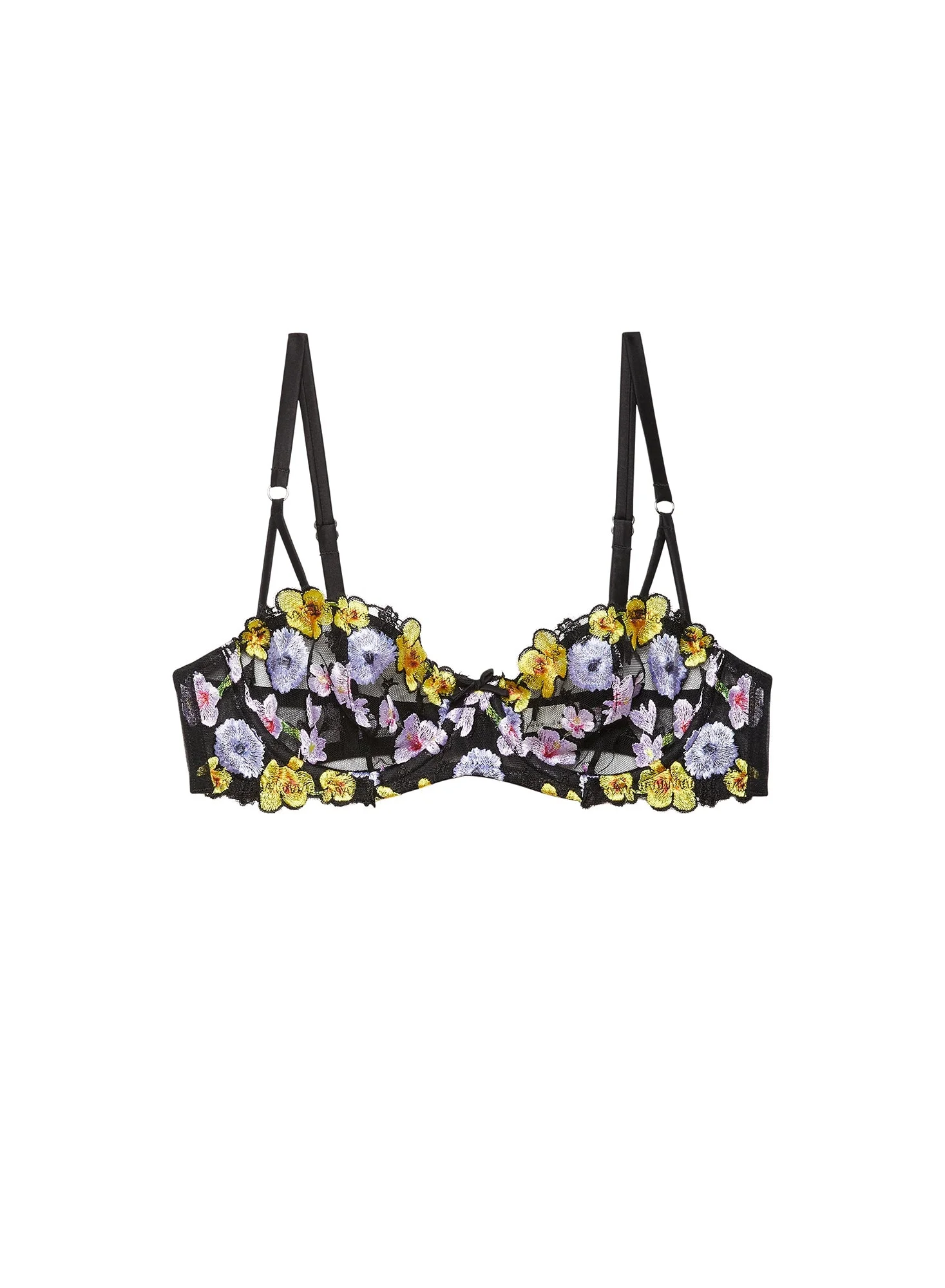 Our flirty Eden Balconette Bra, featuring custom printed floral embroidery on underwire cups with scalloped edge. Stretch mesh wings with back hook & eye closure. Adjustable luxe silk straps with bow detail. Complete this seriously sexy set with the matching Eden Garter Belt and V-String. Materials & Care - Body: 100% Polyester - Combo 1: 92% Silk & 8% Elastane - Combo 2: 85% Polyamide & 15% Elastane - Dry clean or hand wash cold & lay flat to dry. Do not soak. - SKU: BR0491-0100-32A Size & Fit - Model is wearing a size 34B.