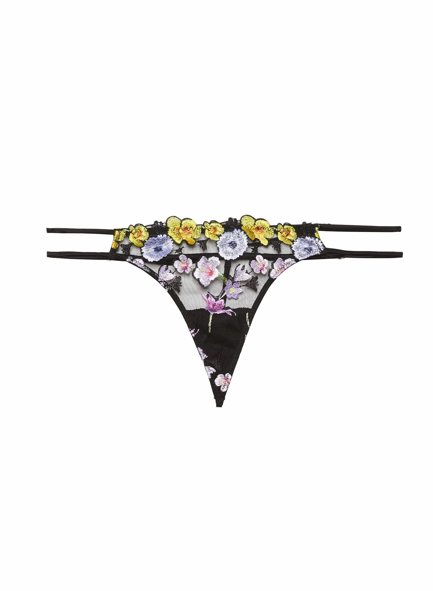 Our Eden V-String, featuring custom printed floral embroidery with stretch mesh paneling on the front. Features scalloped front embroidery detail with silk adjustable side straps. Complete the experience with the matching Eden Balconette Bra or Corset Top and Garter Belt. Materials & Care - Body: 100% Polyester - Combo: 92% Silk & 8% Elastane - Gusset: 100% Cotton - Dry clean or hand wash cold separately & lay flat to dry. Do not soak. - SKU: PY0509-0100-001 Size & Fit - Model is wearing a size 2, the equivalent to size Small.