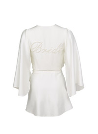 The one & only. Our luxe silk Essentials robe, updated with namesake "Bride" script embroidery. Features a playful fit with wide sleeves and lustrous pearl embroidery. Wraps across the body and is secured by a sash. Say "I do" with the Pearl Luxe V String. Materials & Care - Body: 92% Silk & 8% Spandex - - Dry clean only. - - SKU: RB0099-0300-XSS Size & Fit - Our size equivalency is as follows: S = XS/ S. M = M/ L.