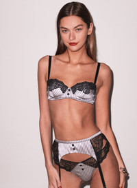 She means business. Our Executive Balconette Bra, featuring pinstripe silk underwire cups with scalloped lace that gently hugs the bust and front button detail. Built-in padding provides subtle shape and lift. Fully adjustable straps with back hook & eye closure. Complete this seriously sexy set with the matching Executive Garter Belt and Thong. Materials & Care - Body: 92% Silk & 8% Elastane - Combo: 61% Recycled Nylon, 20% Nylon & 19% Elastane - Hand wash cold separately, lay flat to dry. Do not soak. - SKU: BR0502-1042-32B Size & Fit - Model is wearing a size 34B.