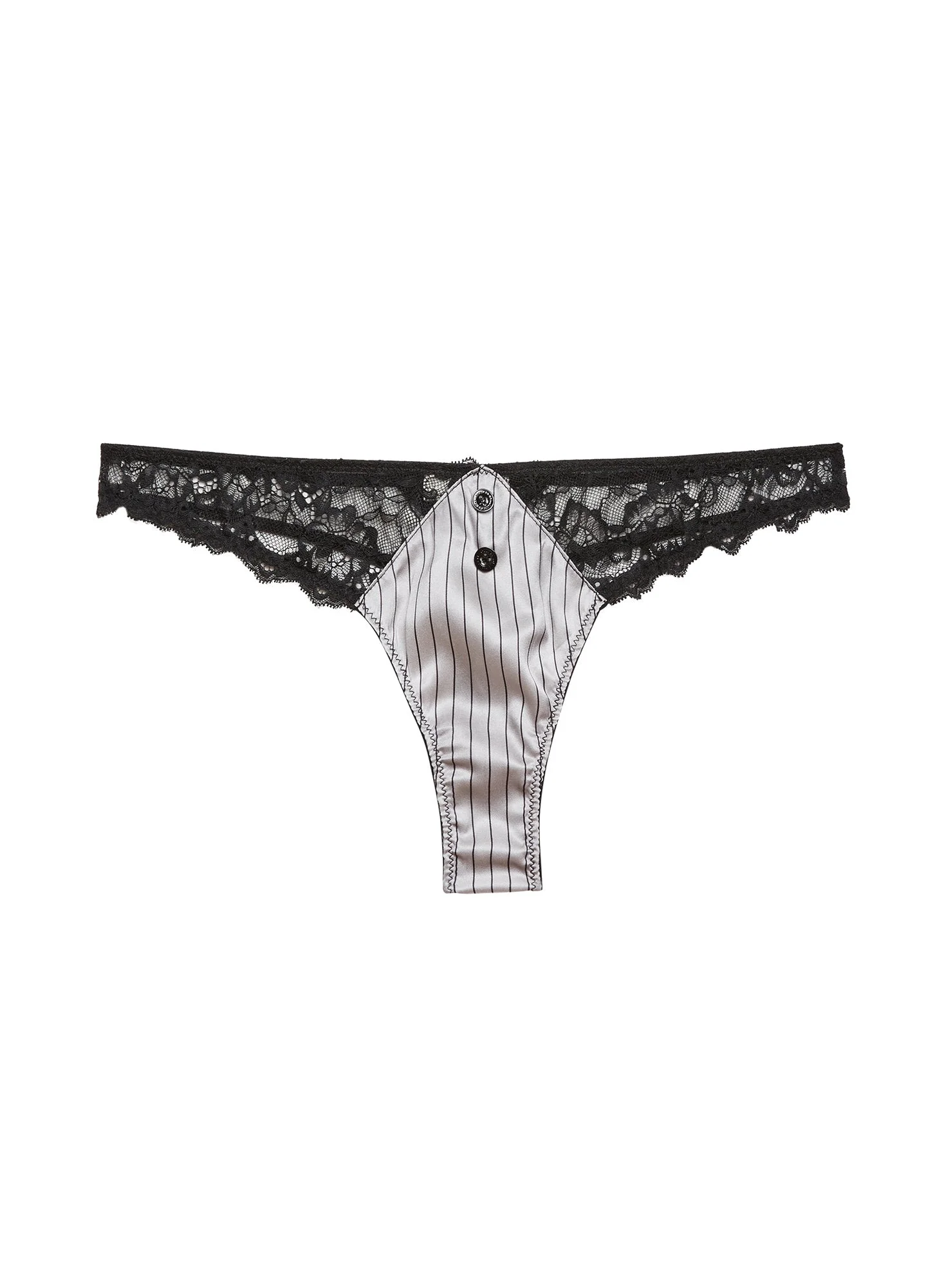 Get down to business in our Executive Thong, cut from luxe pinstripe silk with scalloped lace panels and front button detail. Complete this seriously set with the matching Executive Balconette Bra and Garter Belt. Materials & Care - Body: 92% Silk & 8% Elastane - Combo: 61% Recycled Nylon, 20% Nylon & 19% Elastane - Gusset: 100% Cotton - Hand wash cold & lay flat to dry. Do not soak. - SKU: PY0519-1042-001 Size & Fit - Model is wearing a size 2, the equivalent to size Small.