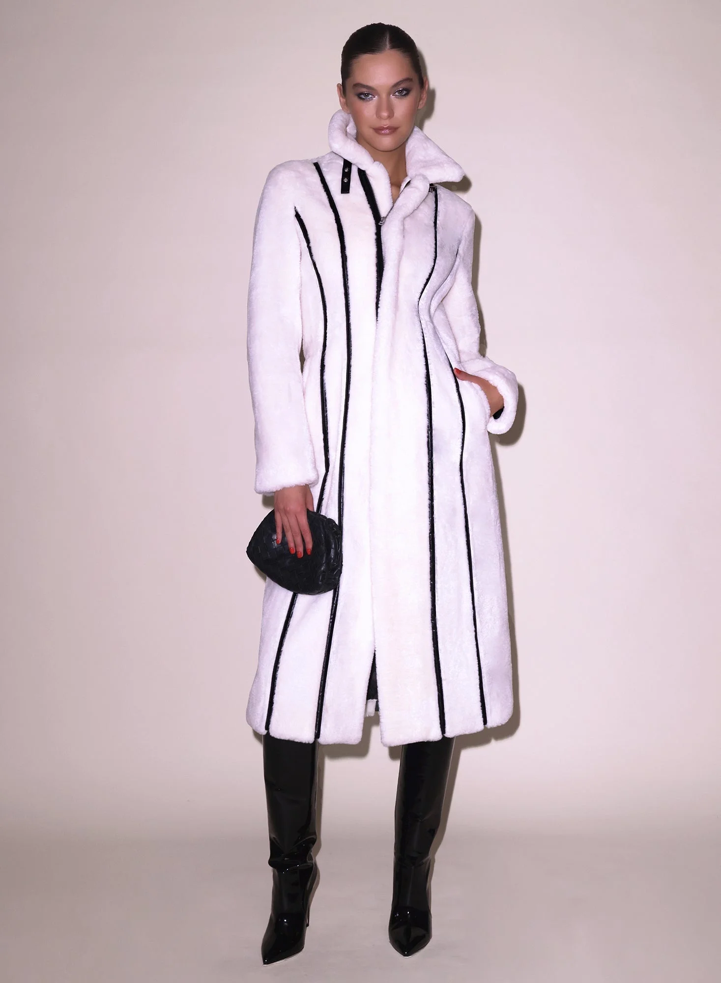Faux real. The Diana Faux Shearling is an essential piece you will wear over everything (or nothing) this season. Features vegan leather piping down with tapered waist and ultra flattering hourglass shaping seams. Center front zip with adjustable belt closure at neck. Lined. Surprise someone late night with the Lily Embroidery Garter and Thong. Materials & Care - Body: 100% Polyester - Combo: 55% Polyester & 45% Viscose - Dry clean only - SKU: OT0082-0970 Size & Fit - Model is 5'11 and is wearing a size Small.
