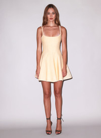 Go from brunch to bar in our flirty Flared Corset Dress. Features low cut square neckline and adjustable straps with scalloped detail. Cut from soft stretch jacquard with corset seaming to show off your waist. Exposed back zipper closure and playful flare skirt. Fitted style, mini length. Layer over your favorite Essentials Panty for a seamless look. Materials & Care - Body: 72% Viscose & 28% Polyester - Dry clean, or hand wash cold & lay flat to dry - SKU: DR0446-1030 Size & Fit - Model is 5'9 and wearing a size S. - Size Small measures 24.25" from neckline to hem.