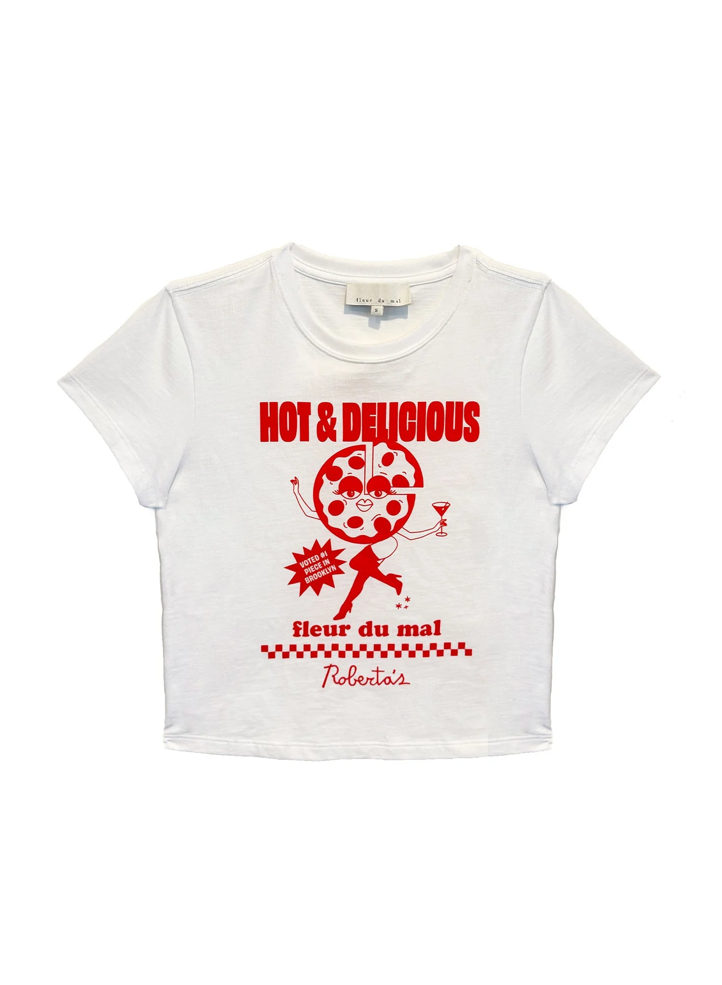 Our exclusive collaboration with Roberta's pizzeria , Fleur X Roberta's Baby Tee cut from 100% organic pima cotton. Ultra comfy white crew neck t-shirt with custom lettering. Relaxed fit. Looks chic taken out with jeans, or lounging with the Luxe Flutter Panty. Materials & Care - Body: 100% Organic Pima Cotton - Hand wash cold with like colors, tumble dry low & remove promptly. Warm iron if needed. - SKU: TP0740-0300 Size & Fit - Model is 5'11 and wearing a size Small.