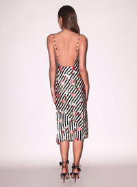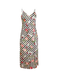 Our Giselle Rose Slip, cut from bias cut silk charmeuse with striped rose and cherry print. Features flattering v-neckline with side slit and adjustable straps. Falls just below the knee. Layer over your favorite Essentials panty for a seamless look. Materials & Care - Body: 92% Silk & 8% Elastane - Dry clean only - SKU: SL0160-1046 Size & Fit - Model is 5'11 and wearing a size Small.
