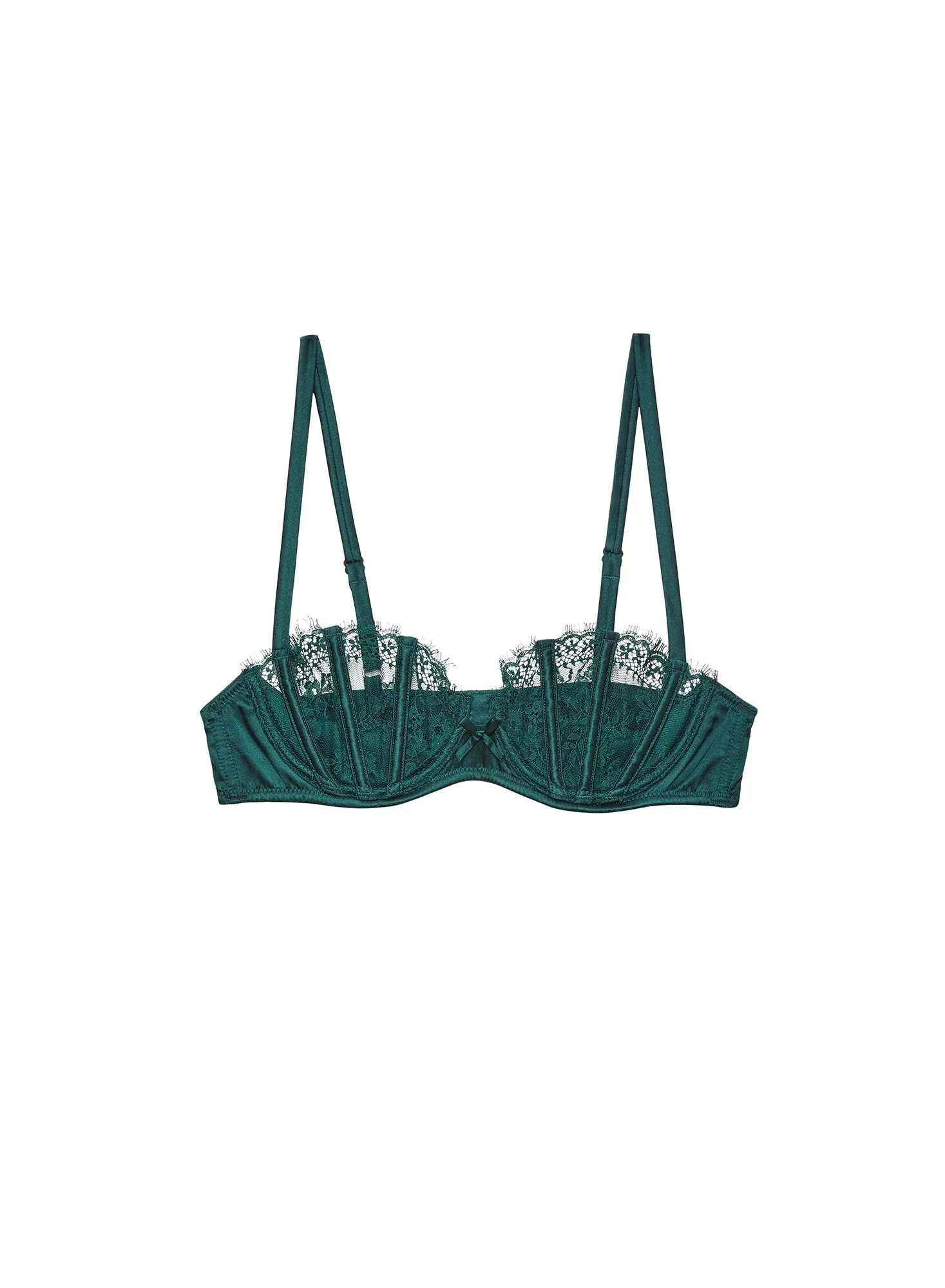 Our stunning Frankie Lace Boned Balconette Bra, featuring delicate French leavers lace cups with silk boning. Silk sling at bottom cup with light foam lining provides subtle lift and shape. Fully adjustable straps with back hook and eye closure for a customized fit. Complete this intoxicating bedroom set with the matching Frankie Lace V-String and Garter. Materials & Care - Lace: 100% Polyamide - Combo: 92% Silk & 8% Elastane - Hand wash cold, lay flat to dry. - SKU: BR0306-0371-32B Size & Fit - Model is wearing a size 34B.