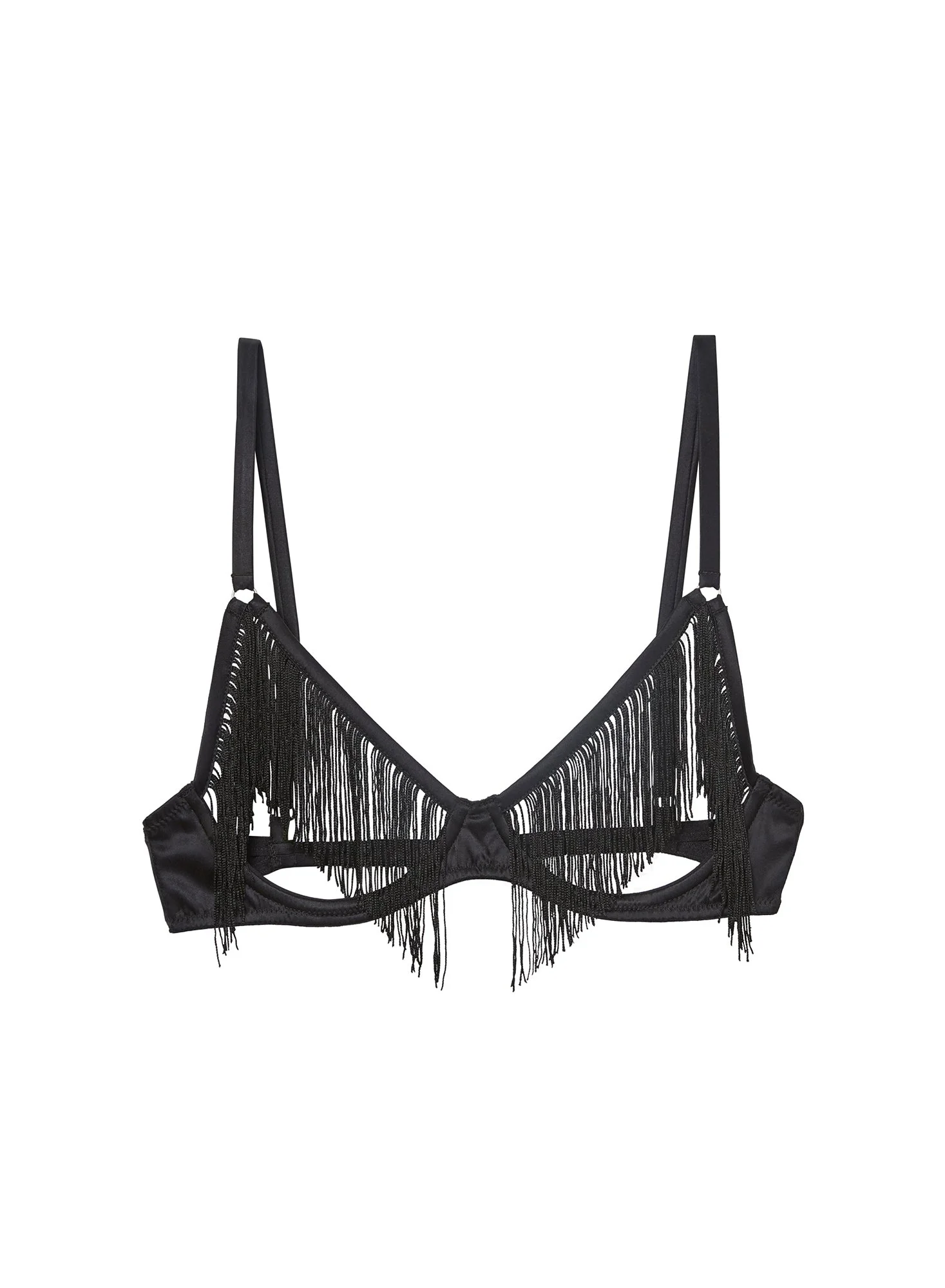 Fringe, with benefits. This ultra hot bondage bra features open, exposed cups with flirty fringe curtain. Underwire and adjustable straps provide subtle shaping and lift. Stretch silk bands with back hook closure. Complete this seriously sexy set with the matching Fringe Ouvert Heart Shaped Panty. Materials & Care - Body: 100% Polyester - Combo: 85% Polyamide & 15% Elastane - Hand wash cold, lay flat to dry - This is a delicate item. Hand wash in cold water with delicate appropriate soap & lay flat to dry. Do not soak or agitate. - SKU: BR0340-0100-32B Size & Fit - Model is wearing a size 34B.