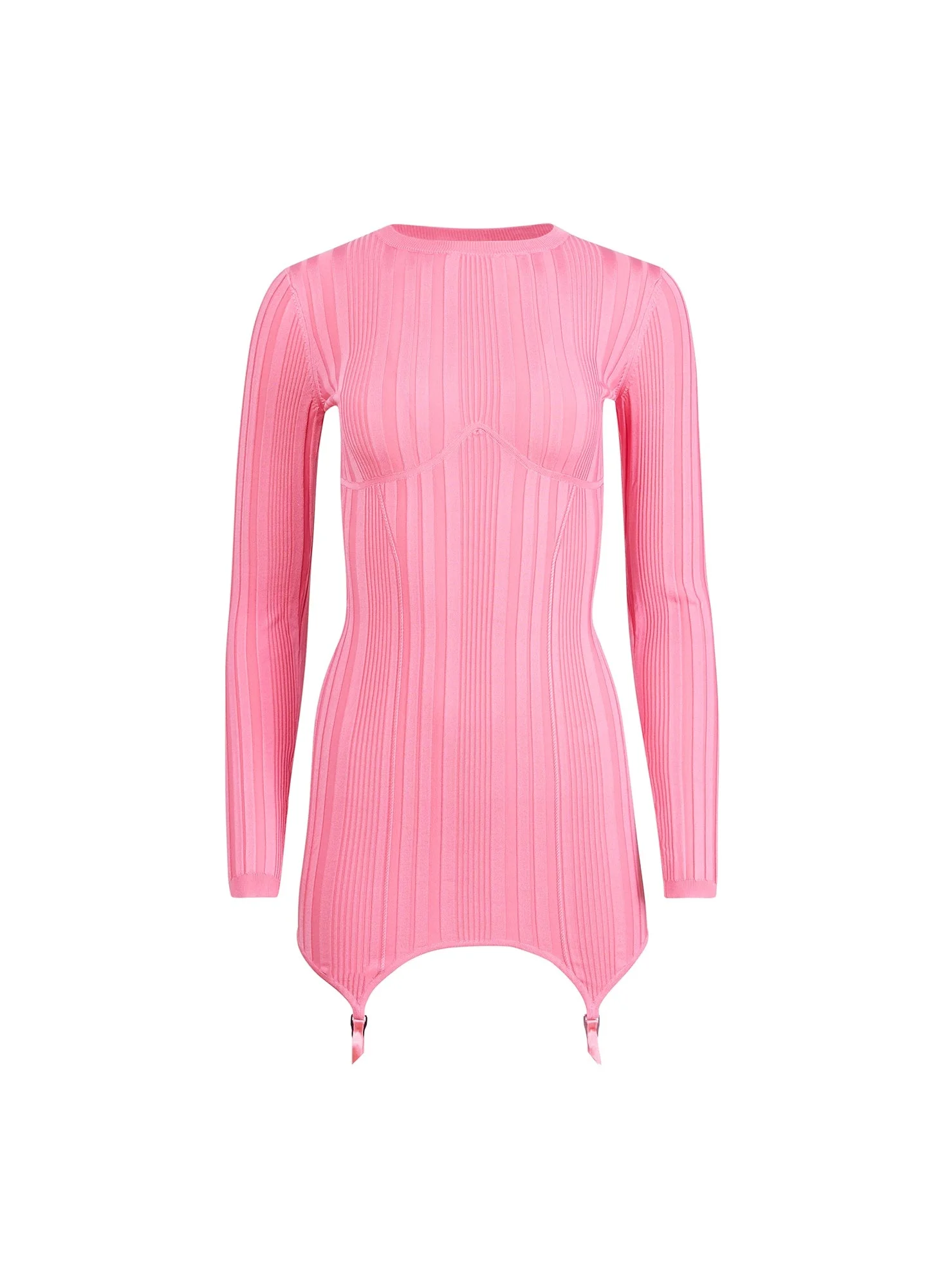 Our Rib Garter Dress, cut from seamless lightweight ribbed knit. Features lingerie inspired underbust detail and functional garter straps at hem. Long sleeve, mini length. Take it out with the Back Seam Thigh High Stocking. Materials & Care - Body: 68% Viscose & 32% Nylon - Dry clean or hand wash cold & lay flat to dry. - SKU: DR0612-0831 Size & Fit - Model is 5'11 and wearing a size Small. - This style runs slightly large. If in between sizes, we recommend sizing down one size.