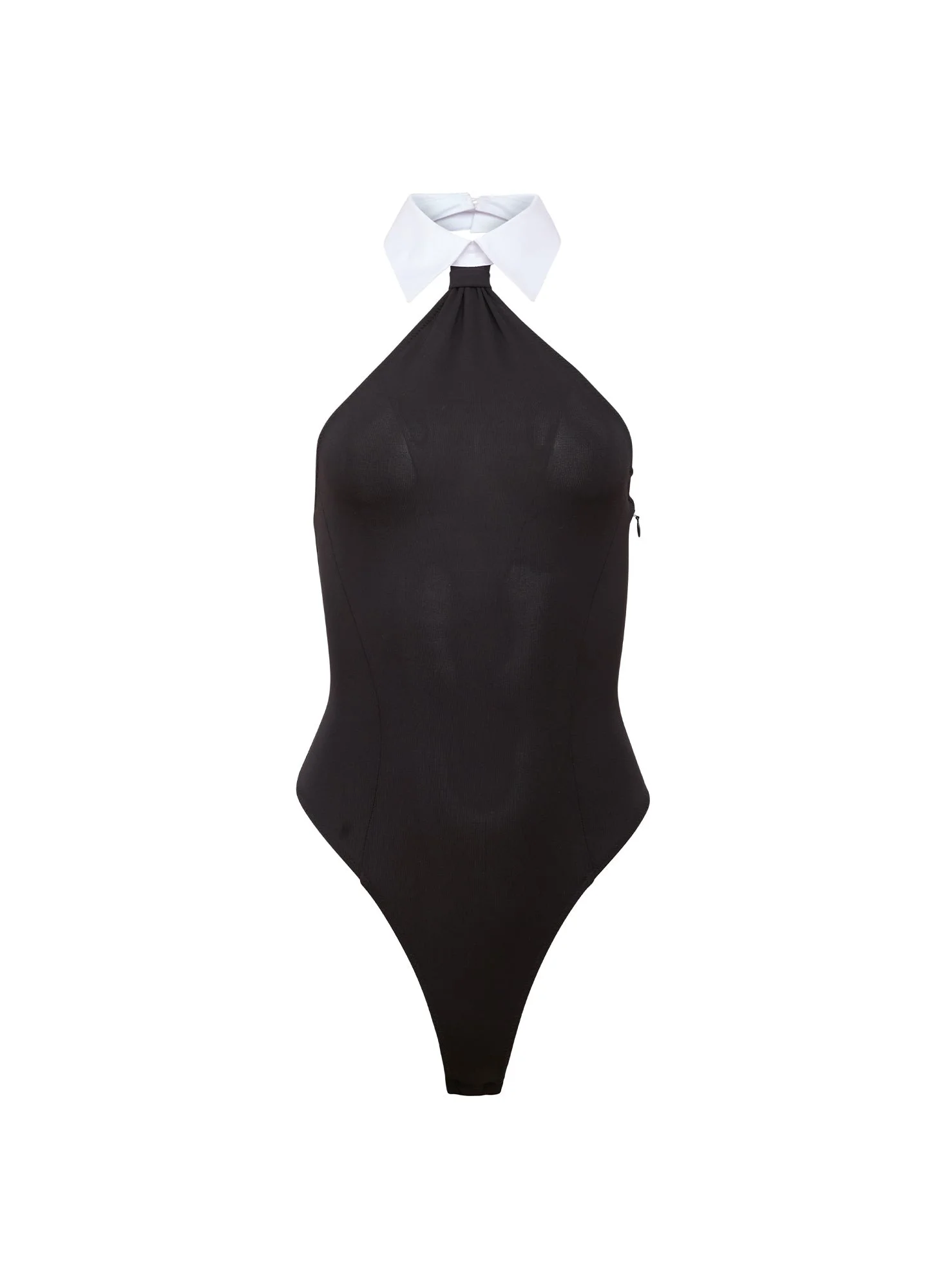 Hot under the collar. Our Hannah Bodysuit, cut from matte jersey with poplin collar and necktie detail. Hook and eye closure at collar, with bottom snaps and thong cut. Looks chic with Undo Me Skirt. Materials & Care - Body: 96% Polyester & 4% Spandex - Combo: 100% Cotton - Gusset: 100% Cotton - Dry clean or hand was cold & lay flat to dry. Do not bleach or tumble dry. - SKU: BS0494-0100 Size & Fit - Model is 5'11 and wearing a size Small.