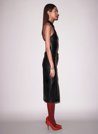 Our vegan leather Harley Skirt, featuring flattering high waist fit with garter seam details and functional pockets. Front slit for added sex appeal. Falls just below the knee. Looks chic with the Harley Bodysuit. Materials & Care - Body: 100% Polyester - Coating: 100% Polyurethane - Lining: 53% Acetate & 47% Viscose - Dry clean only - SKU: SK0216-0100 Size & Fit - Model is 5'11 and is wearing a size Small.