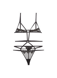 Lovestruck. Play peekaboo in our Heart Embroidery Ouvert Bondage Bodysuit. Features smooth, lustrous heart embroidery details with luxe silk straps crossing throughout the torso and back. Open cups with barely there thong back. Pair with the Angel Sleeve Robe. Materials & Care - Body: 85% Nylon & 15% Spandex - Combo: 92% Silk & 8% Elastane - Gusset: 100% Cotton - Hand wash cold & hang or lay flat to dry. Do not soak. - SKU: BS0411-0100 Size & Fit - Model is 5'11 and wearing a size Small.