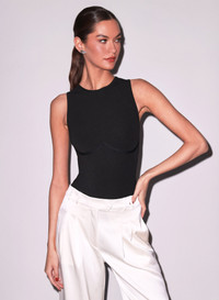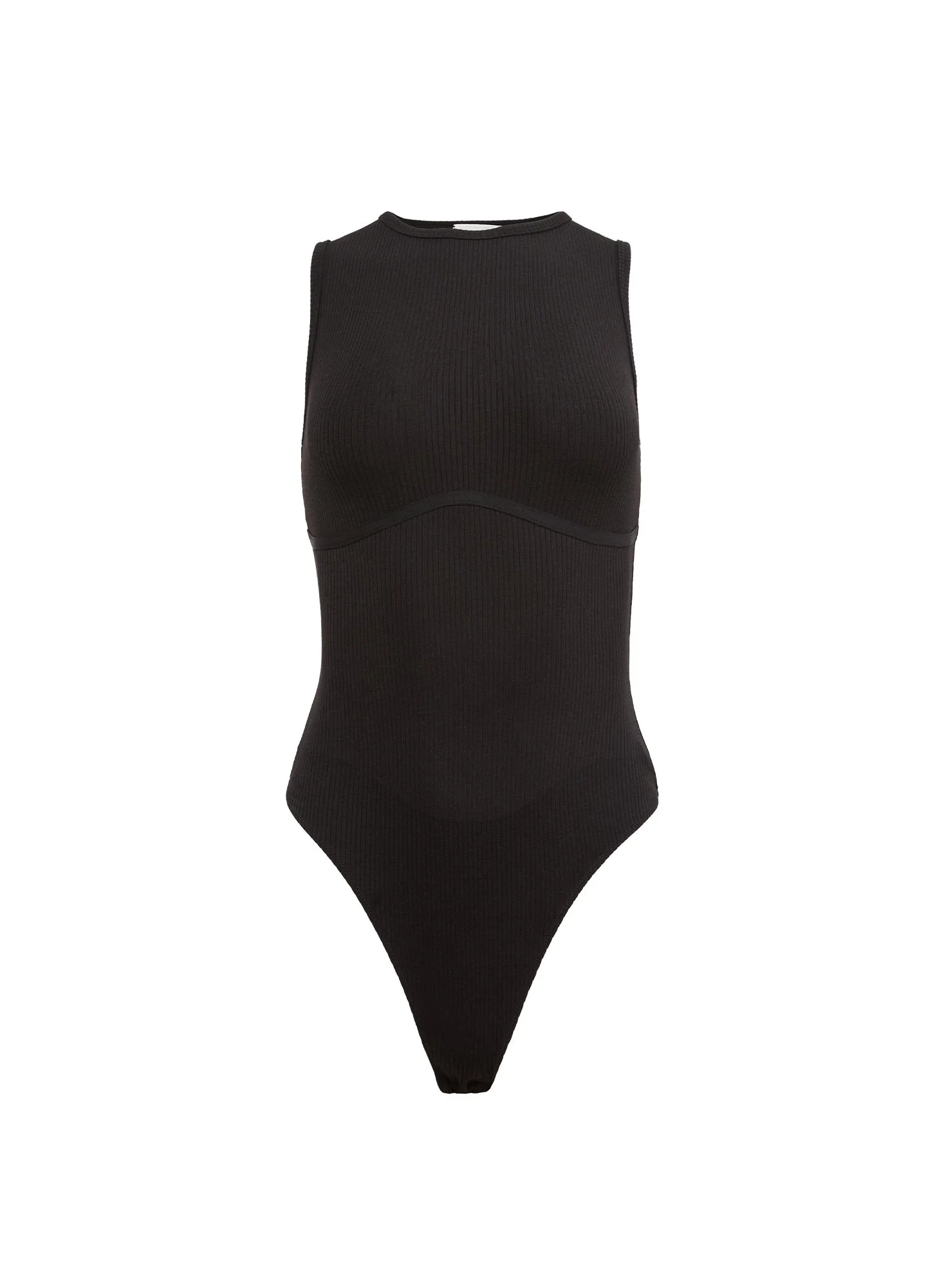 Our Hourglass Rib Bodysuit, featuring lingerie-inspired underbust detail with ultra flattering compression waist to shape and cinch. Thong cut back, bottom snap closure. Take it out with the Satin Trouser. Materials & Care - Body: 72% Polyester, 18% Tencel & 10% Spandex - Lining: 72% Nylon & 28% Spandex - Gusset: 100% Cotton - Hand wash cold with similar colors, hang to dry. Do not soak. - SKU: BS0476-0100 Size & Fit - Model is 5'11 and wearing a size Small.