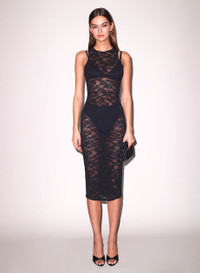 The chicest comfort. Our Le Stretch Lace Racer Tank Dress, cut from ultra comfortable 4-way stretch lace. Features a flattering waist seam & back keyhole detail. Body is unlined. Layer yours over the matching Le Stretch Lace Cheeky to give them an extra peek at what's underneath. Materials & Care - Body: 37% Nylon & 29% Recycled Nylon & 34% Spandex - Combo: 95% Silk & 5% Elastane - Hand wash cold & lay flat dry. Do not Soak. - SKU: DR0586-0100 Size & Fit - Model is 5'11 and wearing a size S.
