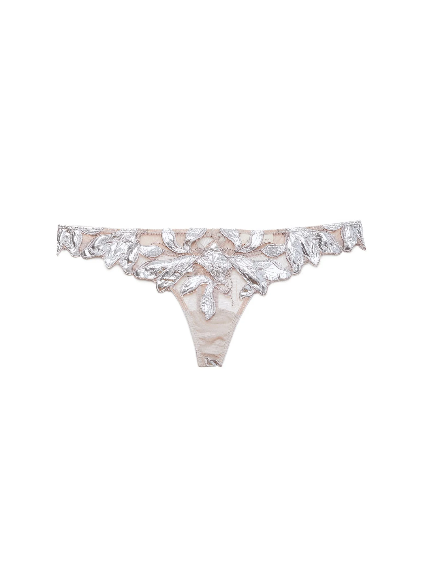 Our Lily Embroidery Hipster Thong in platinum. Features large foiled embroidered lilies with flirty scalloped edges and mesh back. Pair it back to the matching Lily Embroidery Plunge Demi Bra and Garter Belt. Materials & Care - Body: 100% PES - Combo 1: 85% Polyamide & 15% Elastane - Combo 2: 92% Silk & 8% Elastane - Gusset Lining: 100% Cotton - Dry clean or hand wash cold & lay flat to dry. Do not soak. - SKU: PY0328-4300-001 Size & Fit - Model is wearing a size 2, the equivalent to a Small