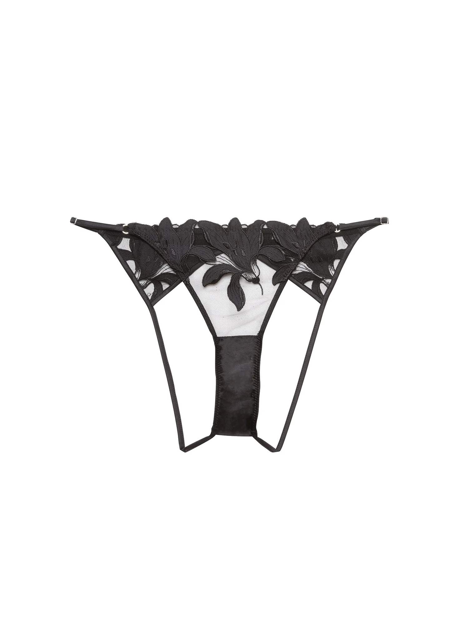 Risque business in the front, party in the back. Our Lily Embroidery Ouvert Panty, featuring our signature satin lily embroidery. Crotchless with an open back. Complete this seriously sexy set with the Lily Embroidery Plunge Demi Bra. Materials & Care - Body: 100% Polyamide - Combo: 92% Silk & 8% Elastane - Dry clean or hand wash cold & lay flat to dry. - SKU: PY0494-0100-001 Size & Fit - Model is 5'11 and wearing a size 2.