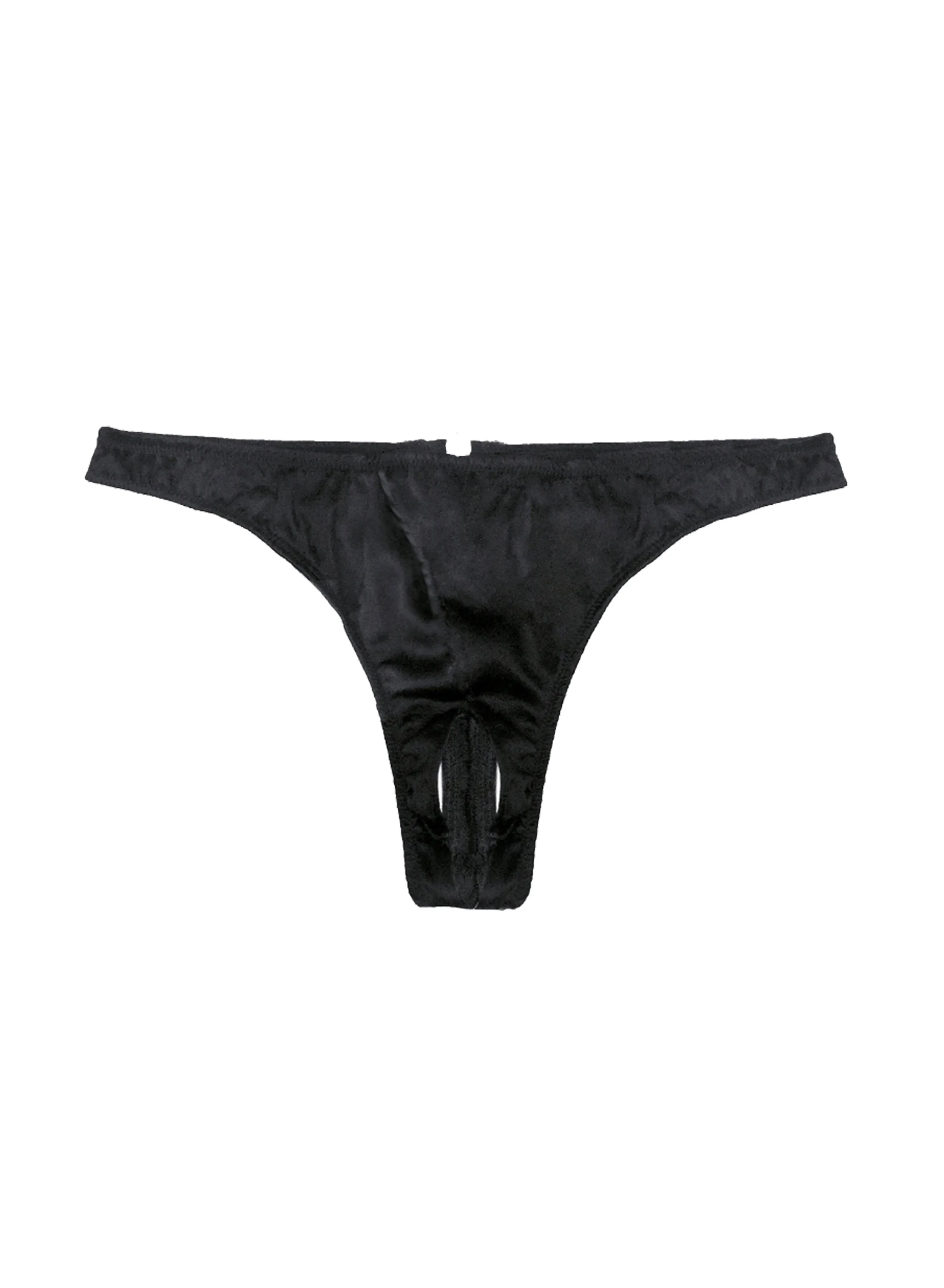 Seriously sexy. Our Luxe Crotchless Thong features o-ring cutout panel at back. Top stitch and front bow detailing. Complete the set with the Luxe Ouvert Bra. Materials & Care - Body: 95% Silk, 5% Elastane - Hand wash cold, hang or lay flat to dry. Do not soak. - SKU: PY0243-0100-001 Size & Fit - Model is wearing a size 2, the equivalent of a size Small