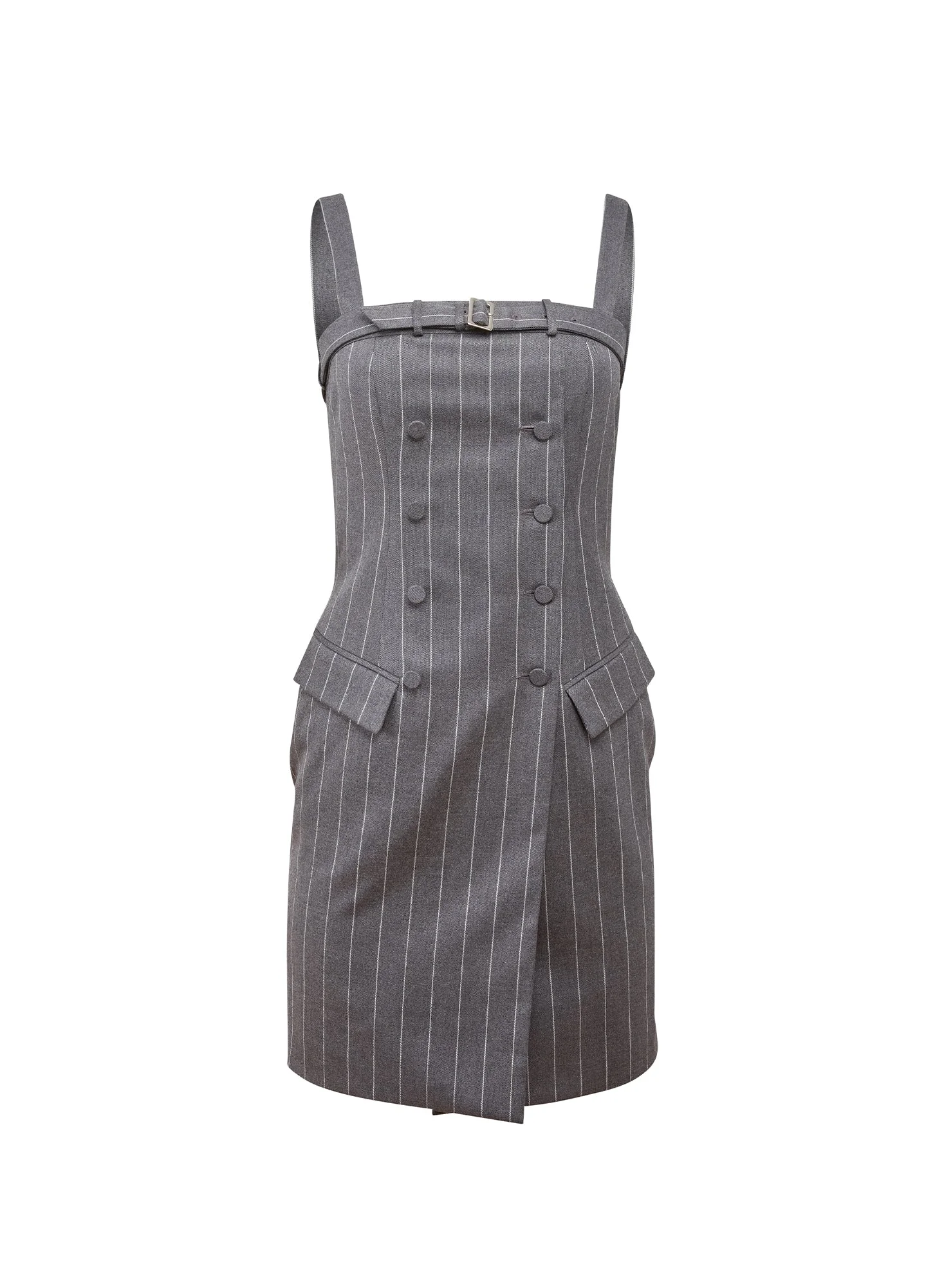 Our Maxwell Mini Dress in dark grey pinstripe, featuring double breasted front buttons with belt detail across the neckline. Adjustable straps, mini length. Looks chic layered with the Maxwell Blazer and Executive Thong. Materials & Care - Body: 34% Rayon, 64% Polyester, & 2% Spandex - Lining: 57% Polyester & 43% Viscose - Dry clean only - SKU: DR0673-1067 Size & Fit - Kiana is 5'11 and wearing a size Small. - Alissa is 5'8 and wearing a size Small.