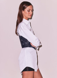 Our No Cup Floral Jacquard Bustier, featuring custom rose jacquard dark wash denim with underwire cups and boning for structure. Exposed back zipper detail and removable adjustable straps. Take it out layered over the Poplin Shirt Dress. Materials & Care - Body: 97% Cotton & 3% Spandex - Combo: 78% Polyamide & 22% Elastane - Lining: 100% Silk - Hand wash cold with similar colors & tumble dry low. Cool iron if needed. - SKU: AC0177-0939 Size & Fit - Model is wearing a size Small.