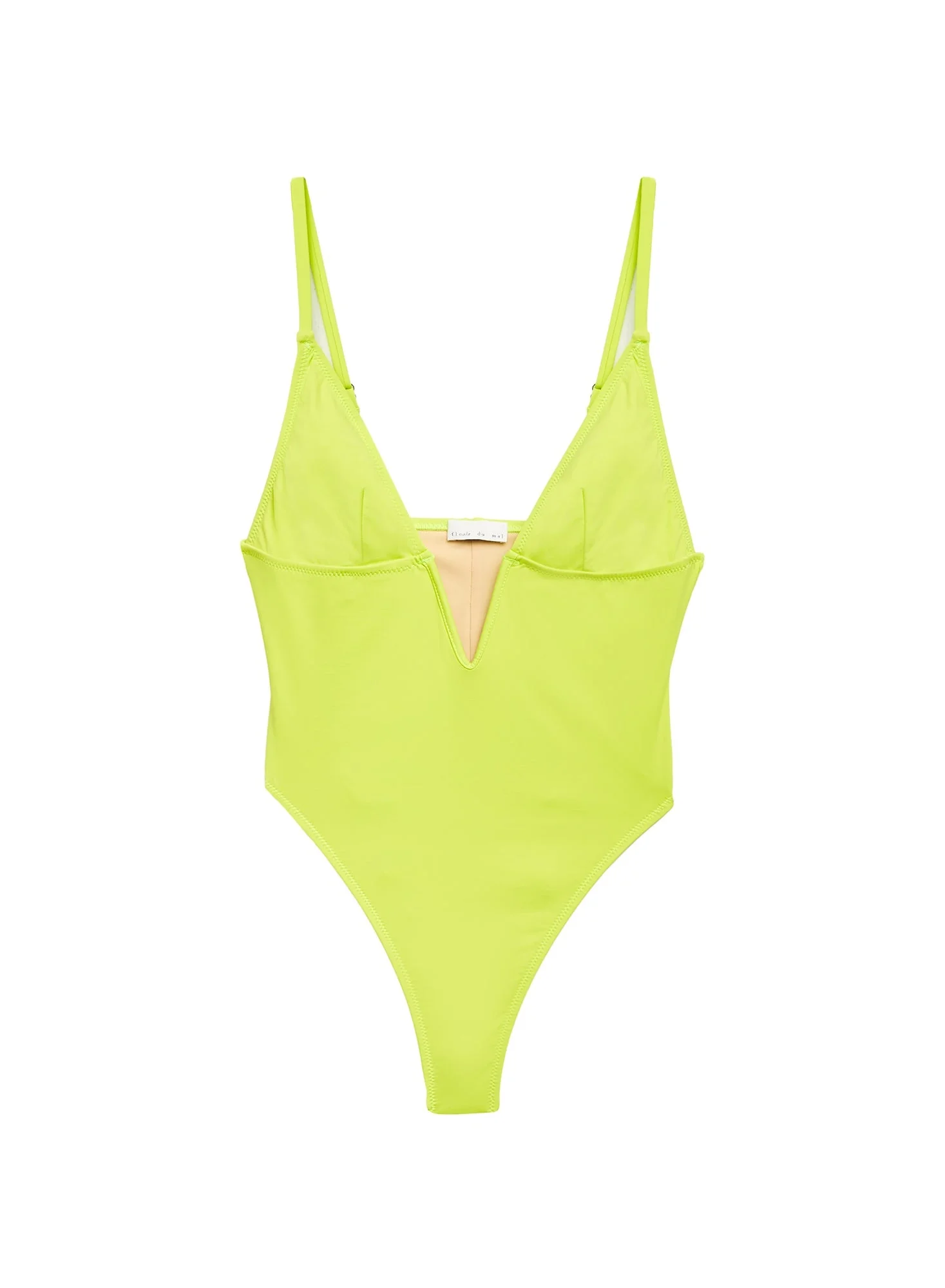 Get in deep. Our One Piece V Wire Swimsuit is the most flattering one piece you can seamlessly wear from beach to bar. Electric avocado color way with adjustable straps and v wire detail. Cut from an Italian stretch fabric that holds you in and flatters the figure. Fully lined with playful cheeky cut. Looks chic with our Washable Silk Wrap Robe. Materials & Care - 80% Polyamide & 20% Elastane - Lining: 90% Polyamide 10% Elastane - Hand wash cold, hang or lay flat to dry - SKU: SW0081-0609 Size & Fit - Model is 5'9 and is wearing size Small.