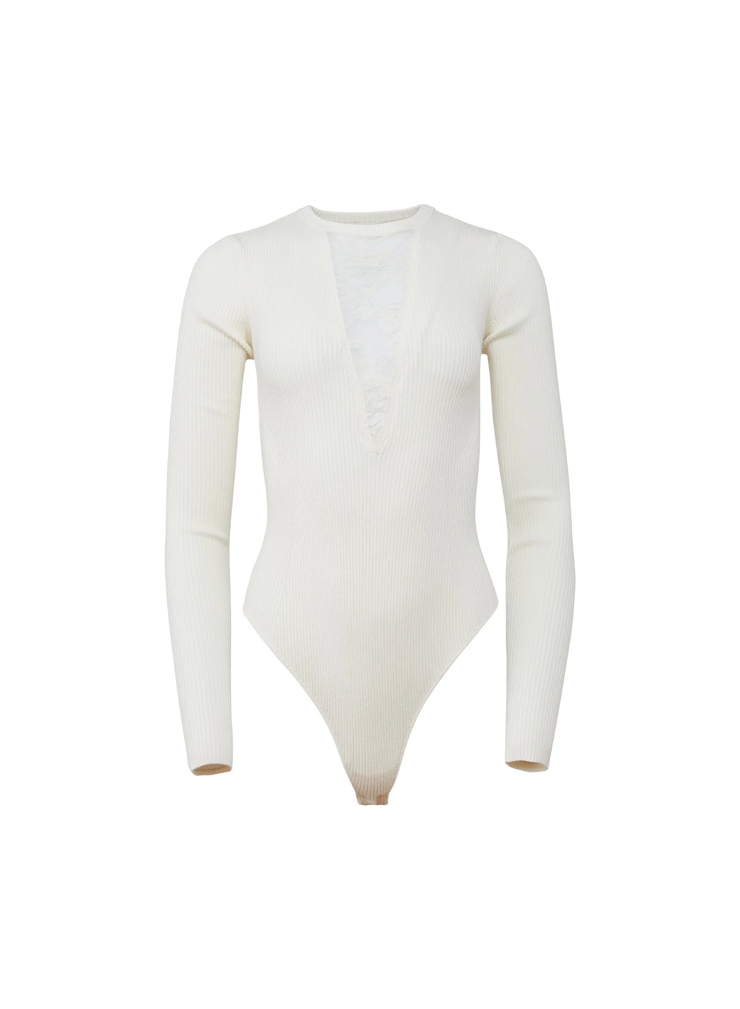 Our Quinn Bodysuit, soft-stretch rib knit featuring front lace insert bottom snap closure. High leg cut. Take it out with the Denim Garter Skirt. Materials & Care - Body: 72%% Viscose & 28% Polyester - Combo: 49% Polyamide, 28% Cotton & 23% Lyocell - Gusset: 100% Cotton - Dry clean or hand wash cold & lay flat to dry. - SKU: BS0495-0300 Size & Fit - Model is 5'11 and wearing a size Small.