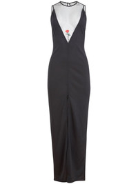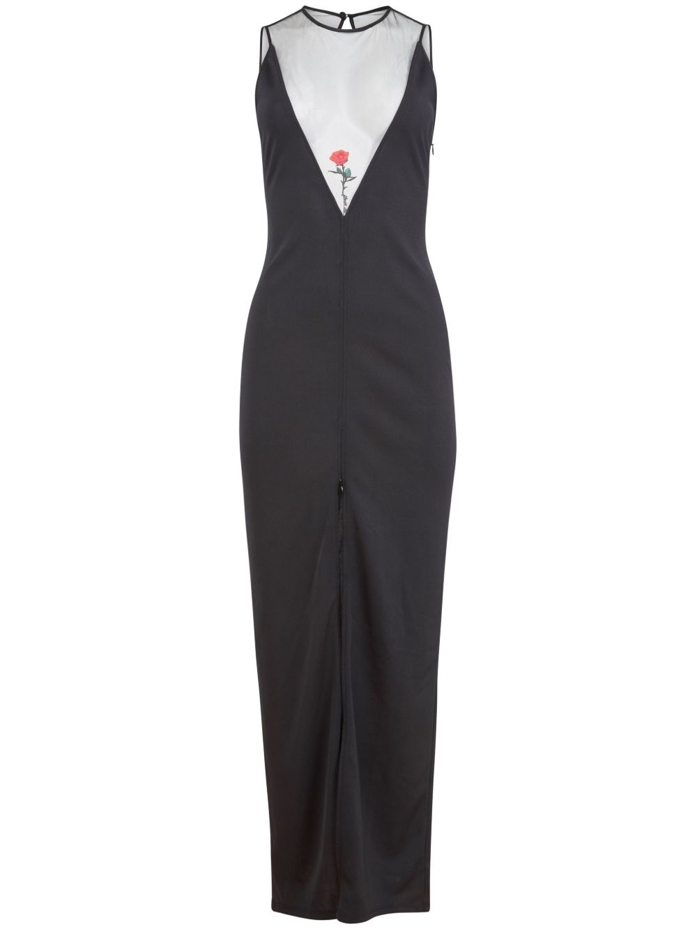 rose-embroidered maxi dress Highlights - Black - Rear button fastening - Embroidered design - Sheer overlay - Front slit Imported Composition Polyester 96%, Spandex/Elastane 4%