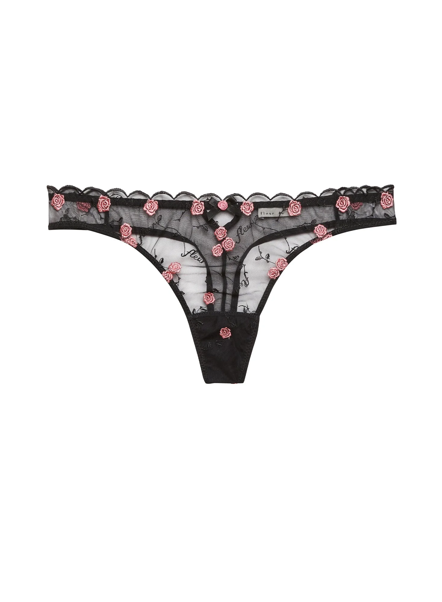 Our Rose & Vine Embroidery Thong, featuring custom rose embroidery with Fleur logo script and rosette bow detail. Flirty scalloped legline and sheer mesh back. Complete this sweet set with the matching Rose & Vine Embroidery Balconette Bra and Garter Belt. Materials & Care - Lace: 100% Polyamide - Embroidery: 100% Polyester - Mesh: 91% Polyamide & 9% Elastane - Gusset: 100% Cotton - Hand wash cold & hang or lay flat to dry. Do not soak. - SKU: PY0437-0100-001 Size & Fit - Model is wearing a size 2, the equivalent to size small.