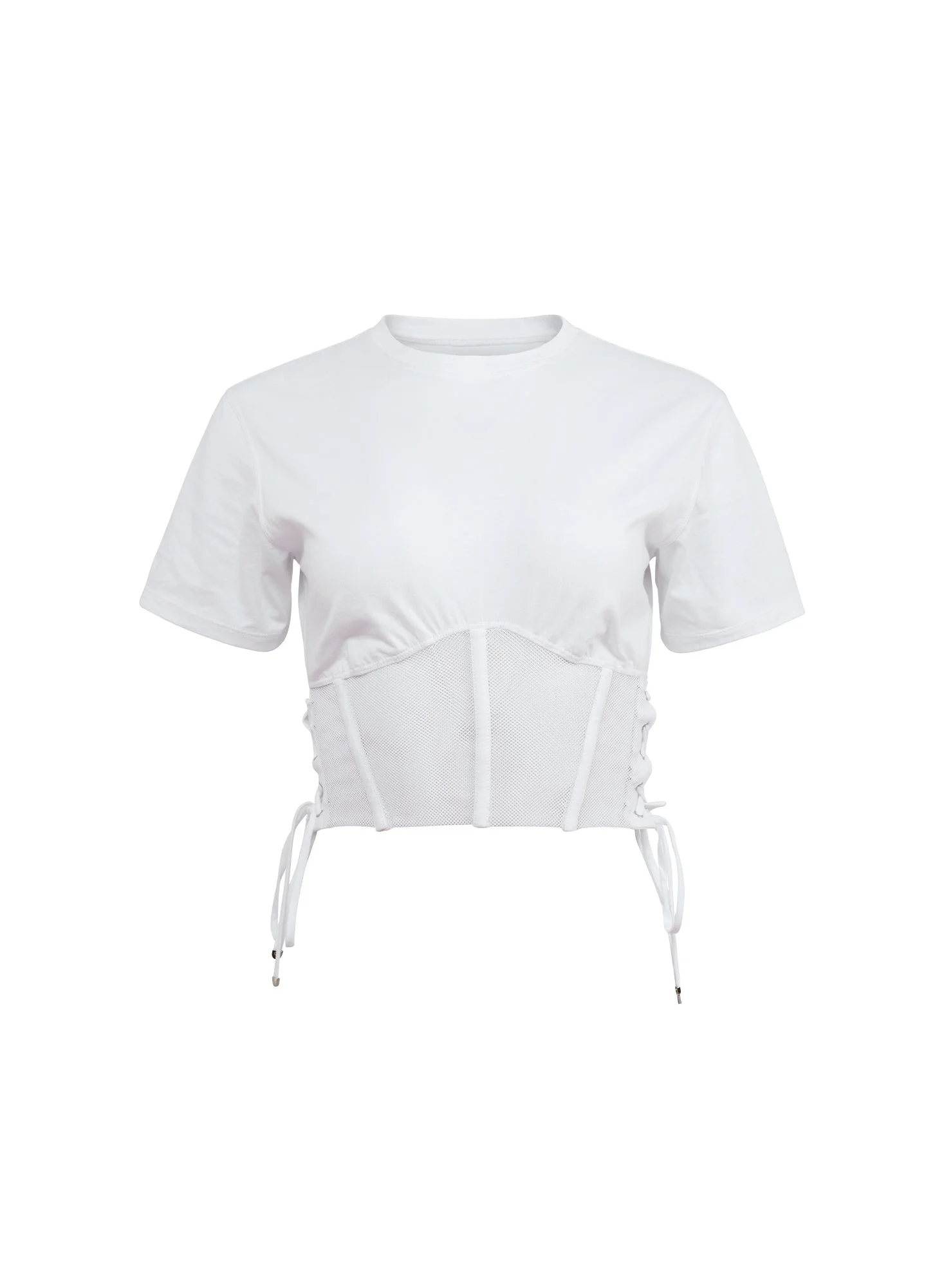 Our Sabrina Corset T-Shirt, cut from lightweight cotton with sporty mesh bottom panel. Features boning channels to sculpt and flatter your figure with side lace up detail for added edge. Invisible zipper to ensure proper fit. Pair with jeans or elevate your favorite pair or trousers. Materials & Care - Body: 100% Pima Cotton - Combo: 78% Polyamide & 22% Spandex - Dry clean only - SKU: TP0689-0300 Size & Fit - Model is 5'11 and wearing a size Small.