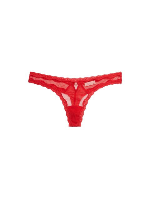 Ideal for every day. Soft stretch Italian tulle thong lined with flirty lace trim. Subtle silver ring and playful keyhole at back. Pair yours with matching Sheer Tulle Demi Bra. Materials & Care - Body: 82% Polyamide & 18% Elastane - Lace Trim: 81% Nylon & 19% Spandex - Gusset: 100% Cotton - Hand wash cold & hang, or lay flat to dry. Do not soak. - SKU: PY0067-1000-001 Size & Fit - Model is wearing a size 2, the equivalent to size Small.
