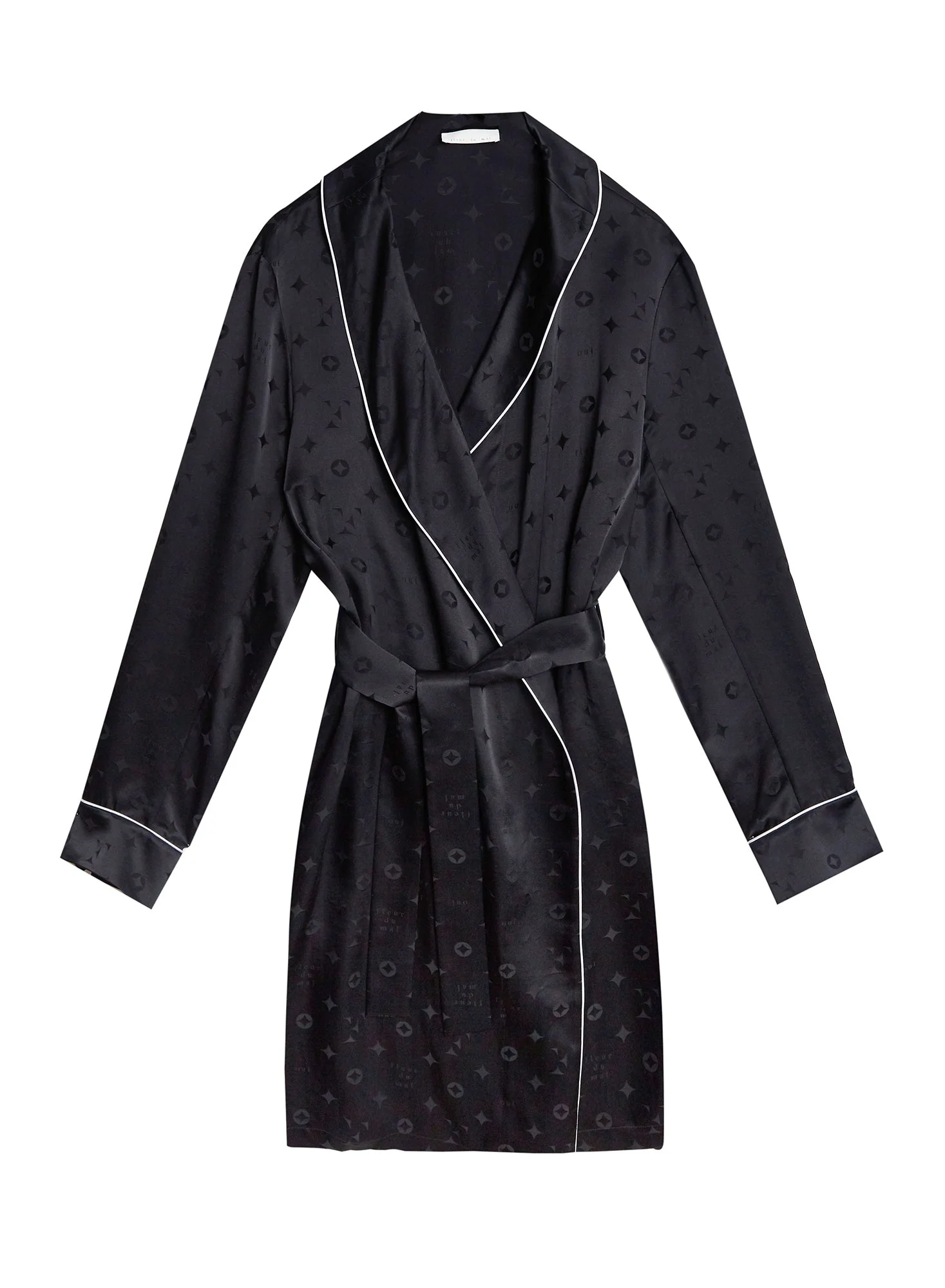 For the playboys. Our Silk Jacquard Robe is 100% silk with custom Fleur monogram print. White piping detailing with pockets and tie closure at waist. Layer it over the Men's Bouquet Lace Boxer Brief or Unisex Boxer Short. Materials & Care - 100% Silk - Dry clean only - SKU: RB0105-0100 Size & Fit - Model is 6'1 and wearing a size S/M.