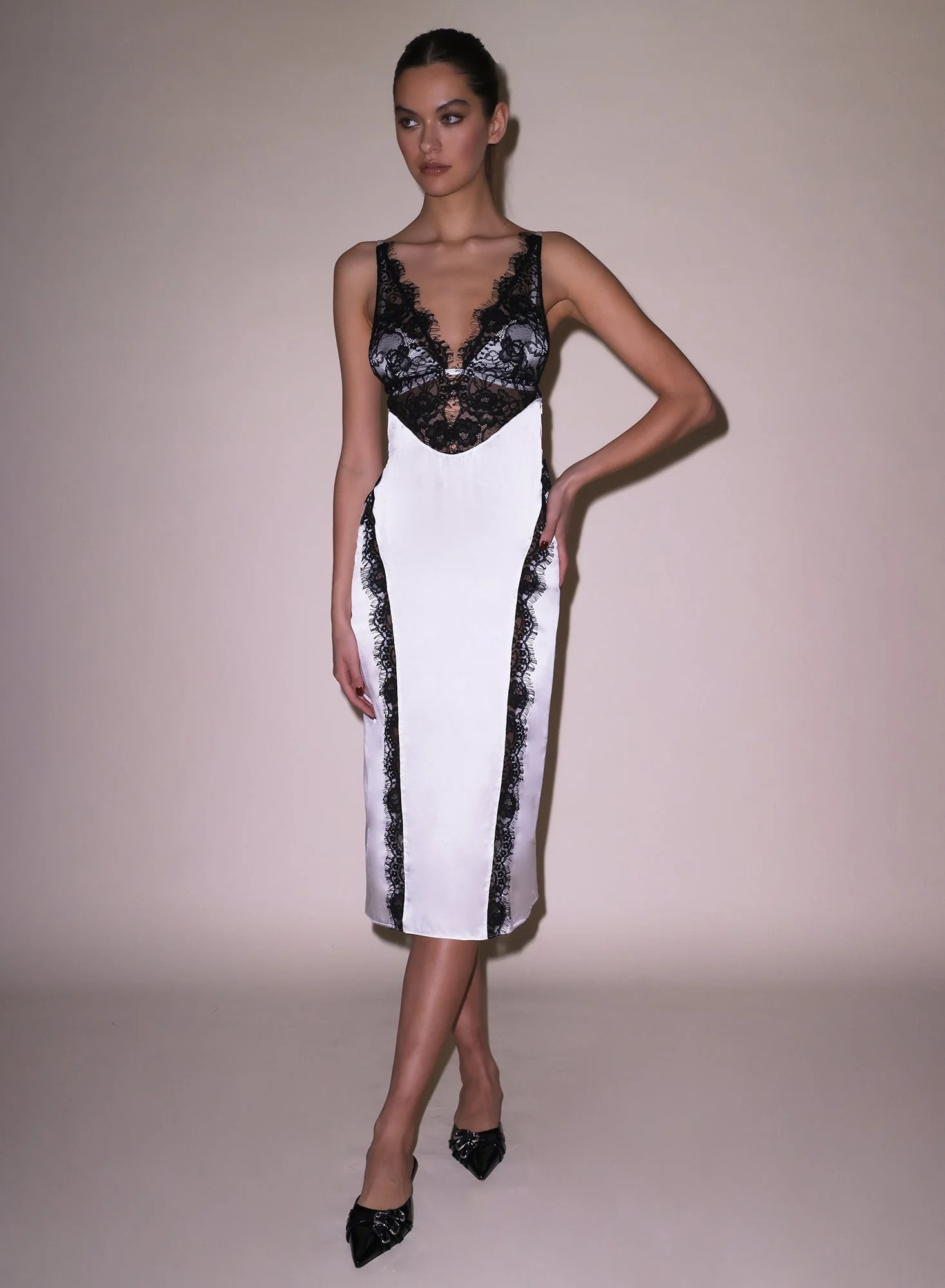 Our Silk & Lace V Neck Dress, cut from luxe bias cut silk charmeuse with contrasting lace overlay. Features triangle style cups with adjustable straps and g-hook closure for support. Layer over your favorite Essentials panty for a seamless look. Materials & Care - Body: 100% Silk - Combo: 50% Nylon, 40% Cotton, & 10% Lyocell - Dry clean only - SKU: DR0525-0300 Size & Fit - Model is 5'10 and wearing a size Small.