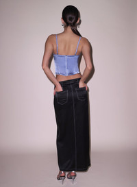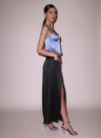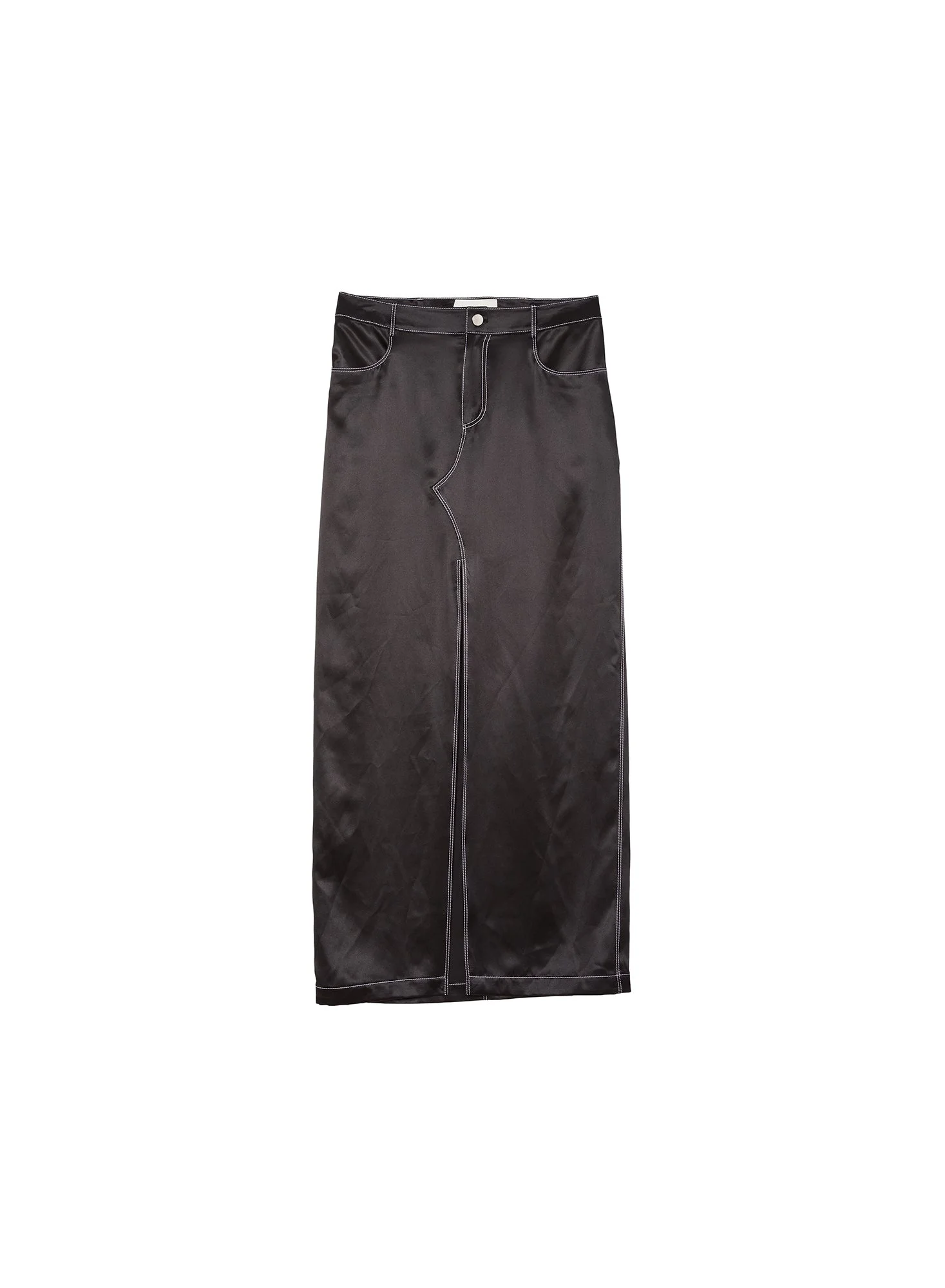 Luxe silk charmeuse maxi skirt with denim inspired top stitch detailing and pockets. Low rise fit designed to worn just below the waist. Looks chic with the Hamptons Bustier or matching Silk & Lace Bra Top. Materials & Care - Body: 100% Silk - Dry clean only - SKU: SK0185-0100 Size & Fit - Model is 5'11 and wearing a size 4.