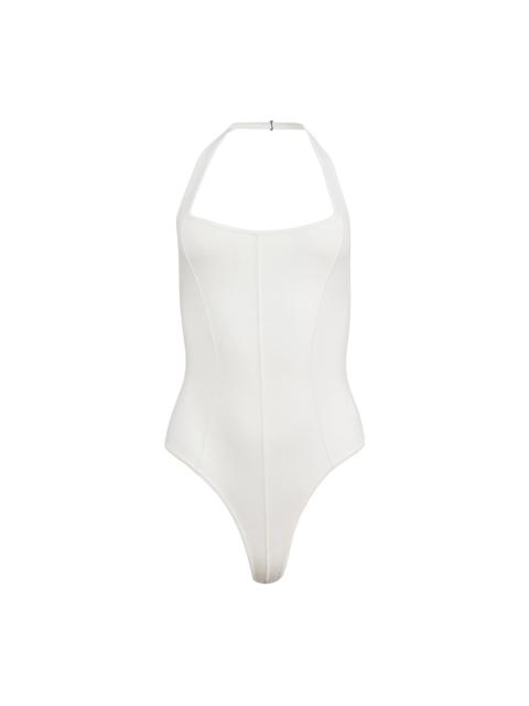 Our Sofia Bodysuit, featuring flattering halter scoop neck and strappy open back. Cut from soft stretch jacquard with corset seaming to show off your waist. Thong cut back and bottom snap closure. Take it out with the Satin Trouser. Materials & Care - Body: 70% Cotton & 30% Polyester - Dry clean or hand wash cold & lay flat to dry. - SKU: BS0482-0543 Size & Fit - Model is wearing a size Small.