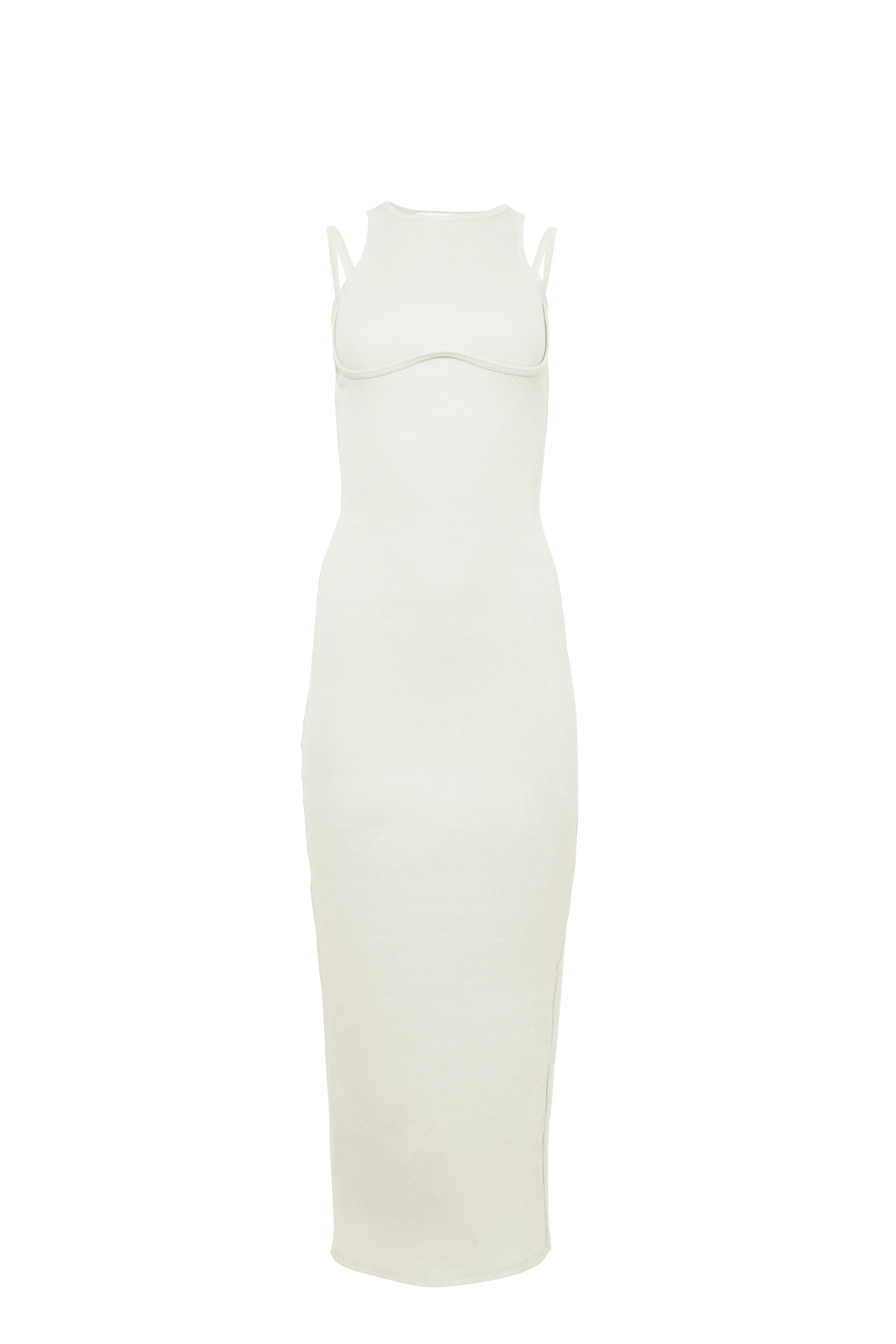 Our Strappy Ribbed Maxi Dress, featuring classic column shape with flattering racer back. Cut from luxe ribbed knit with underbust detail that continues onto shoulder straps. Hits at the ankle. Layer over the Charlotte Spacer Plunge Bra and Seamless Thong. Materials & Care - Body: 97% Cotton & 3% Spandex - Hand wash with similar colors & lay flat to dry. Do not iron or soak. - SKU: DR0531-0910 Size & Fit - Model is 5'11 and wearing a size S.
