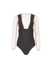 Our chic Suspender Bodysuit, featuring luxe stretch jersey body with sheer mesh arms and chest. Plunge suspender straps and high waisted bottom. Back zipper closure, snap button gusset. Take it out with the Silk Georgette Wide Leg Pant. Materials & Care - Body: 67% Polyamide & 33% Elastane - Combo: 90% Nylon & 10% Spandex - Gusset: 100% Cotton - Dry clean, or hand wash cold & cool iron - SKU: BS0413-0100 Size & Fit - Model is 5'11 and wearing a size S.