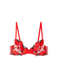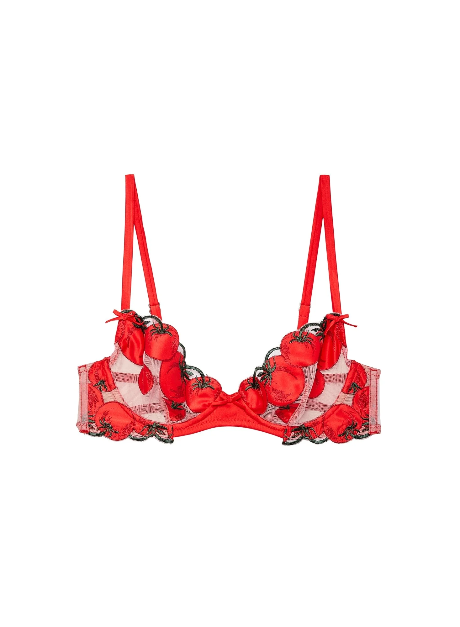 Our Pomodoro Embroidery Demi Bra, featuring custom satin tomato embroidery on sheer tulle. Underwire cups with silk gore and fully adjustable silk straps for subtle shaping and lift. Pair with the matching Pomodoro Embroidery Garter and V String for a set that's good enough to eat. Materials & Care - Body: 100% Polyester - Combo 1: 92% Silk & 8% Elastane - Combo 2: 85% Polyamide & 15% Elastane - Hand wash cold, lay flat to dry. Do not soak. - SKU: BR0448-0895-32A Size & Fit - Model is wearing a size 34B.