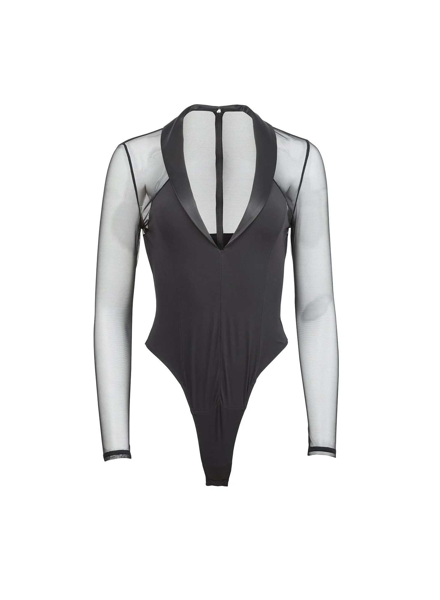 Our Tuxedo Bodysuit, featuring sexy plunge neckline with silk lapels and stretch mesh sleeves. Comfortable Italian stretch recycled jersey body with back zipper and bottom snap closure. Take it out with the Tuxedo Pant. Materials & Care - Body: 74% Polyamide & 26% Elastane - Combo 1: 100% Silk - Combo 2: 90% Nylon & 10% Spandex - Dry clean only - SKU: BS0448-0100 Size & Fit - Model is wearing a size S.