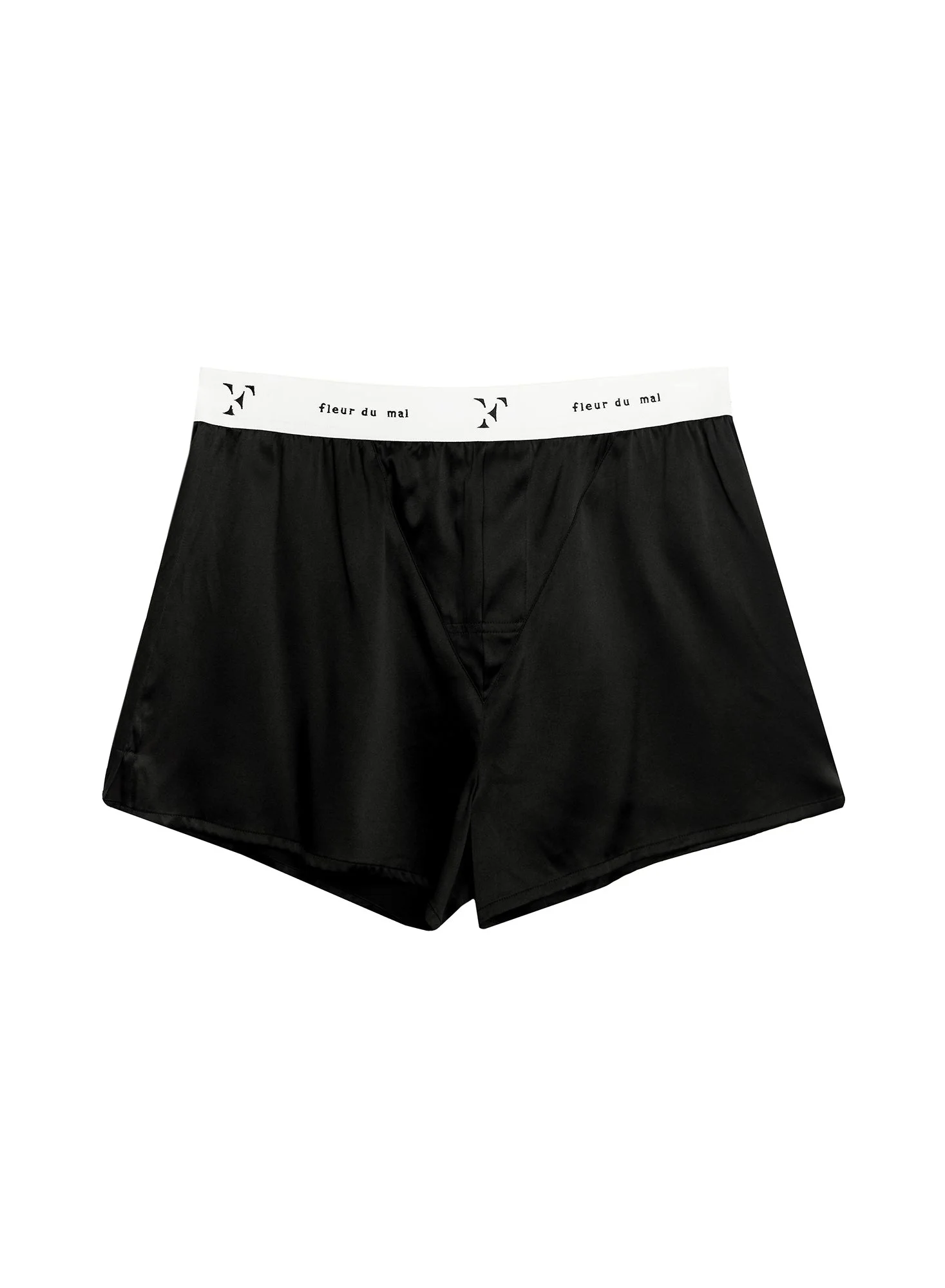 His & hers. Our ultra luxe silk Unisex Boxer Short in classic black. Gender neutral with a comfortable fit. Features elastic logo waist band and fly vent. Pair with the Men's Silk Jacquard PJ Top. Size equivalency as follows: - Women's XS = Men's XXS - Women's S = Men's XS - Women's M = Men's S - Women's L = Men's M - Women's XL = Men's L - Women's XXL = Men's XL Materials & Care - Body: 92% Silk & 8% Elastane - Hand wash cold, lay flat to dry - SKU: SH0101-0100 Size & Fit - Male model is 6'0 and wearing a M which equals a Women's L.