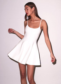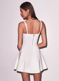 Go from brunch to bar in our flirty Flared Corset Dress. Features low cut square neckline and adjustable straps with scalloped detail. Cut from soft stretch jacquard with corset seaming to show off your waist. Exposed back zipper closure and playful flare skirt. Fitted style, mini length. Layer over your favorite Essentials Panty for a seamless look. Materials & Care - Body: 72% Viscose & 28% Polyester - Dry clean, or hand wash cold & lay flat to dry - SKU: DR0446-0300 Size & Fit - Model is 5'10 and wearing a size S. - Size Small measures 24.25" from neckline to hem.