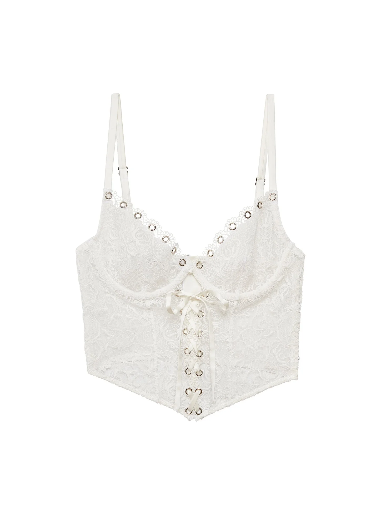 All eyes on you. Our flirty Eyelet Embroidery Lace Up Bustier, with custom eyelet embroidery and adjustable silk lace up front. Features grommet detailing and scalloped underwire cups. Mesh back with exposed zipper detail, adjustable straps. Pair with the Eyelet Embroidery V String for an ultra hot bedroom set, or take it out with your favorite pair of boyfriend jeans. Materials & Care - Body: 100% Polyester - Combo: 85% Polyamide & 15% Elastane - Combo 2: 92% Silk & 8% Elastane - Dry clean, or hand wash cold & lay flat to dry. Do not soak. - SKU: TP0572-0300 Size & Fit - Model is 5'9 and wearing a size 2.