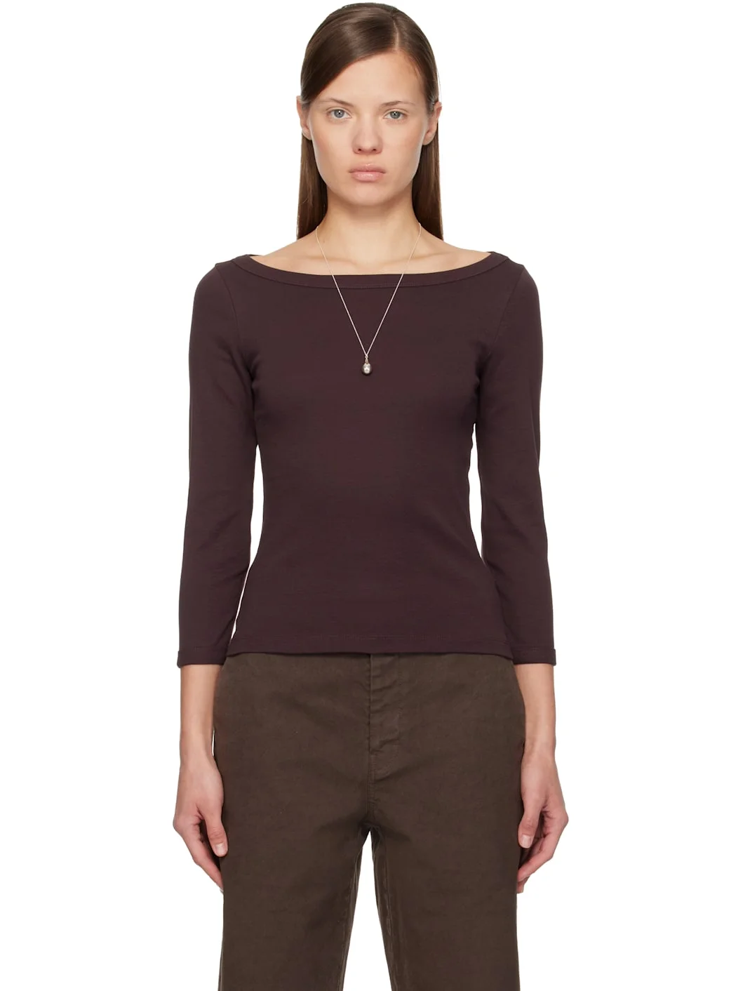 Organic cotton jersey T-shirt. · Rib-knit boatneck and cuffs · Three-quarter sleeves · Central seam at back Supplier color: Choco plum 100% organic cotton. Made in Portugal 261924F110004