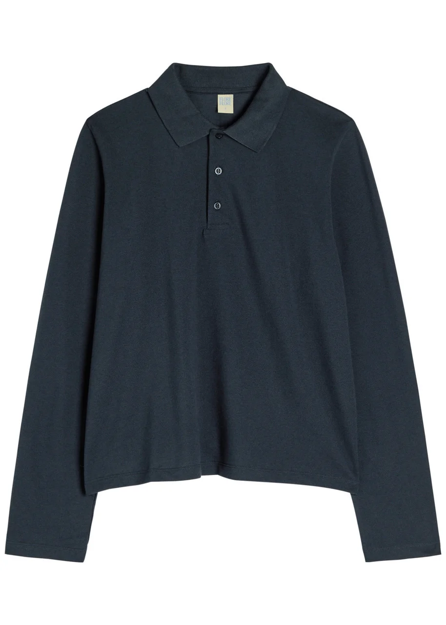 Info & Care FLORE FLORE cotton pique polo shirt Button-fastening neck, ribbed trims Slips on 100% organic cotton; Machine wash Size & Fit Length shoulder to hem: 24 inches/ 61cm Midweight Loose fit Model is 5'9"/ 175cm and wears a size small