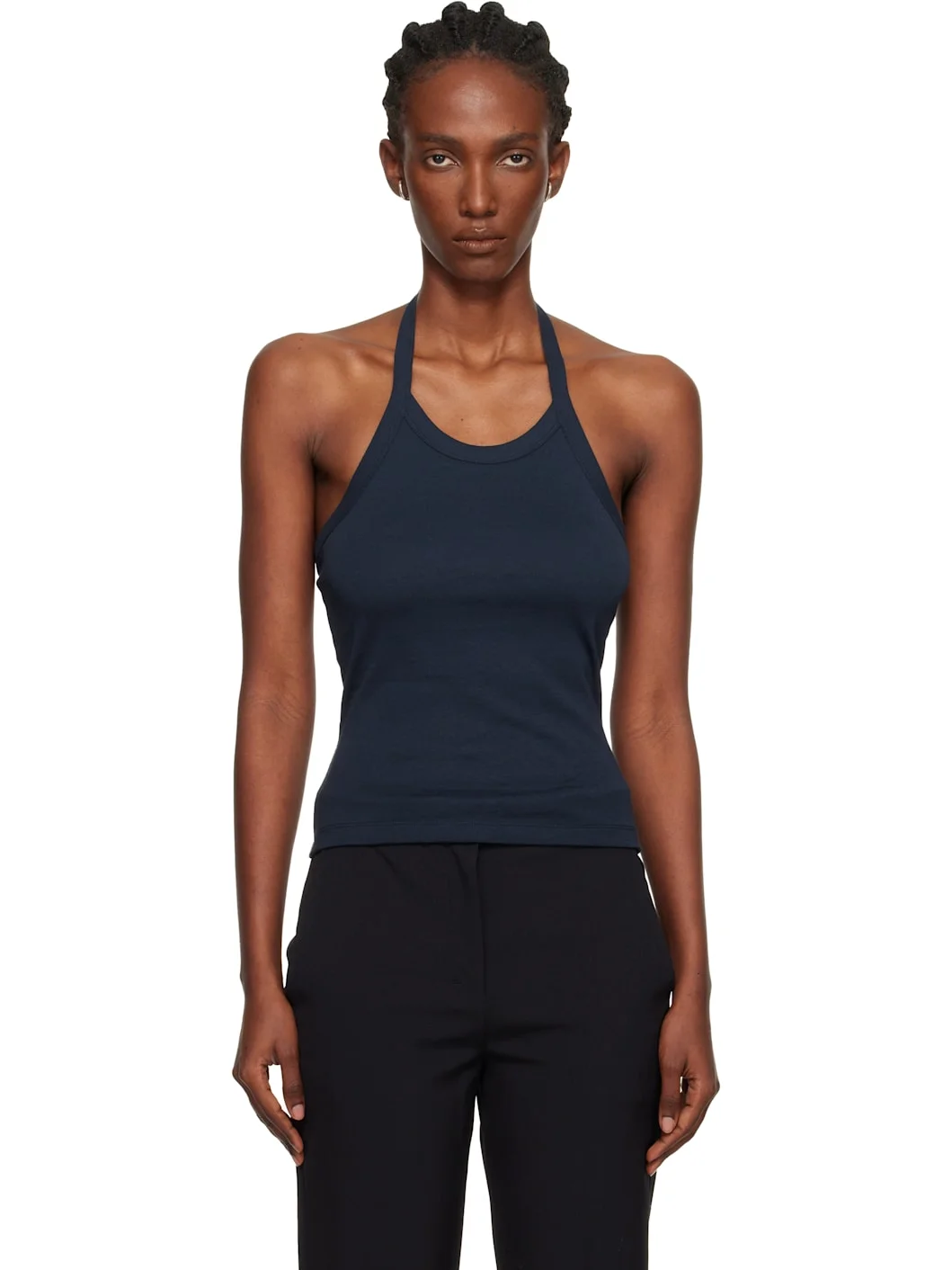 Organic cotton jersey tank top. Rib-knit crewneck and fixed halter strap. Supplier color: Navy 100% organic cotton. Made in Portugal 261924F111043