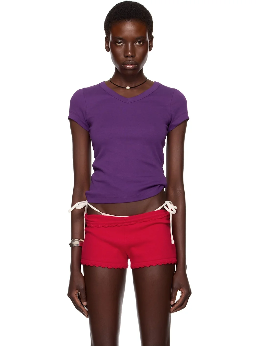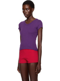 Organic cotton jersey T-shirt. · Rib-knit V-neck and cuffs · Central seam at back Part of the exclusive SSENSE HEAT capsule. Supplier color: Imperial purple 100% organic cotton. Made in Portugal 252924F110046