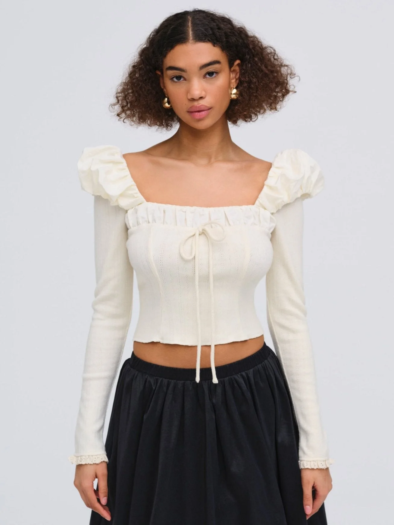 The Aliyah Pointelle long sleeve cream top is your go-to for chic everyday style, or a sleek date night look. Crafted in a knit pointelle, this puff sleeve top spotlights a ruched poplin panel neckline and elegant sleeves with a delicate lace trim. Fit Notes - The Aliyah Pointelle Top is designed to be tight fitting. - We suggest taking your regular size. Style Notes - Picot trim at the back neckline Fabric + Care - Crafted in 48% rayon, 27% polyester, 21% nylon, 4% spandex - Contrast is 78% cotton, 22% spandex - Lining is made of 100% polyester - Dry clean only