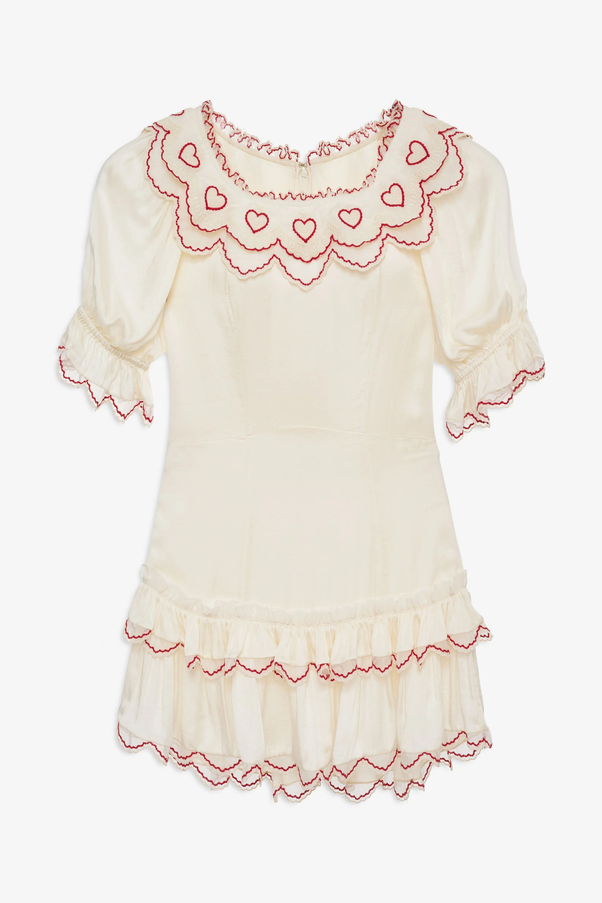 The ultimate satin mini dress for the modern romantic. A perfect Valentine’s Day dress and a dreamy way to step into spring, the Amor Mini Dress features a ruffled neckline adorned with red beaded hearts and feminine cap sleeves. Style Notes - Wide neckline with beaded ruffled collar - Elasticized puff sleeves with ruffles - Fitted bodice with princess seams - Curved beaded ruffled hem - Center back zipper - Unlined Fabric + Care - Crafted in 100% viscose - Trim fabric is made of 100% polyester - Dry clean only